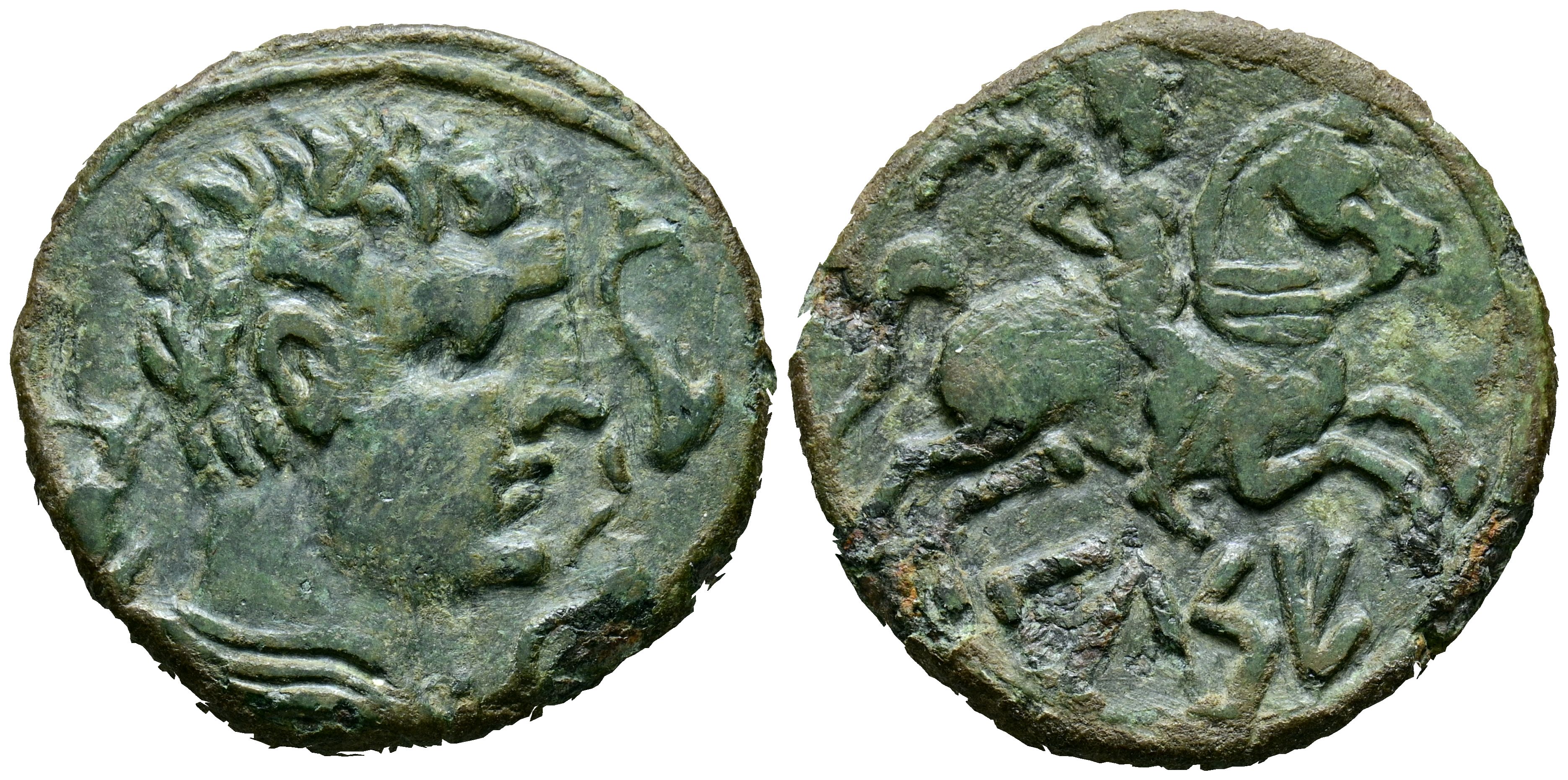 CELSE (Velilla del Ebro, Zaragoza). As. (Ae. 10,94g/26mm). 120-50 a.C. (FAB-771). Anv: Cabeza a derecha con manto y fíbula a derecha, alrededor tres delfines. Rev: Jinete con palma a derecha, debajo leyenda ibérica sobre línea: CeLSE. MBC.