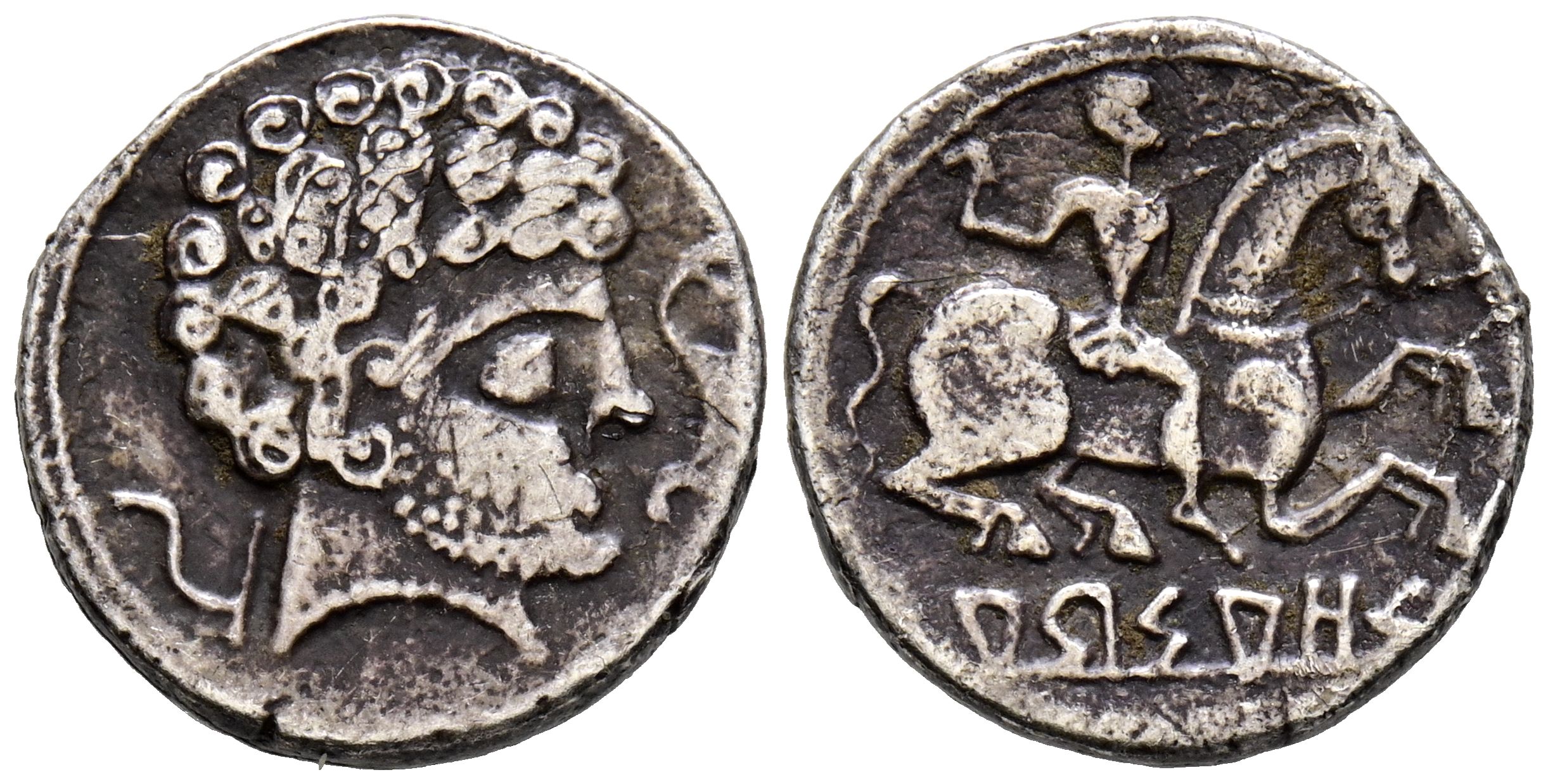 ARSAOS (Zona de Navarra). Denario. (Ar. 3,35g/17mm). 120-80 a.C. (FAB-139). Anv: Cabeza masculina barbada a derecha, delante delfín, detrás arado. Rev: Jinete con dardo a derecha, debajo leyenda ibérica sobre línea: ARSAOS. MBC-.