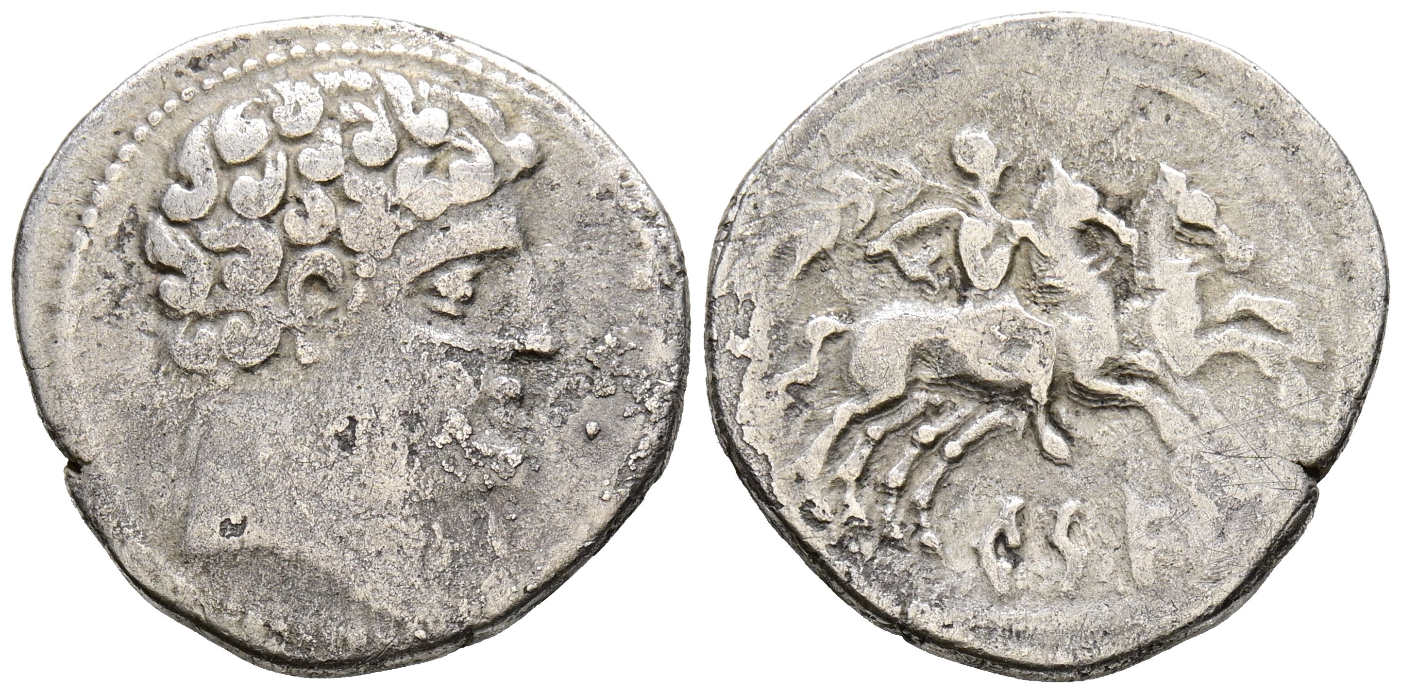 CESE (Tarragona). Denario. (Ar. 3,65g/20mm). 120-20 a.C. (FAB-2266). Anv: Cabeza masculina a derecha. Rev: Jinete con palma a derecha conduciendo segundo caballo, debajo leyenda ibérica sobre líne: CeSE. MBC-.