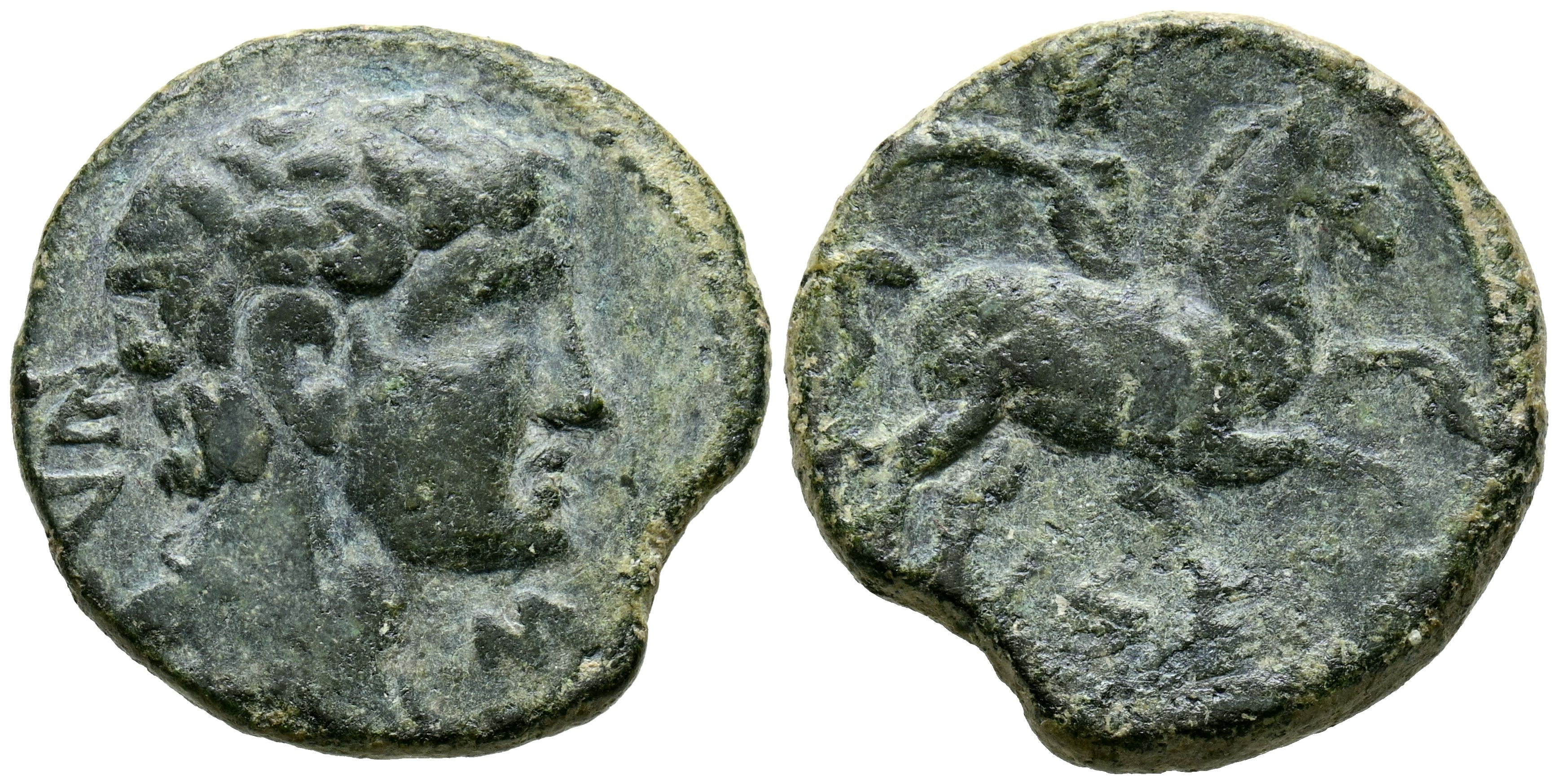 CESE (Tarragona). As. (Ae. 7,53g/24mm). 120-20 a.C. (FAB-2295). Anv: Cabeza masculina a derecha, detrás letras ibéricas: IL, delante S. Rev: Jinete con palma a derecha, debajo leyenda ibérica: CeSE. MBC. Copel ligeramente faltado.