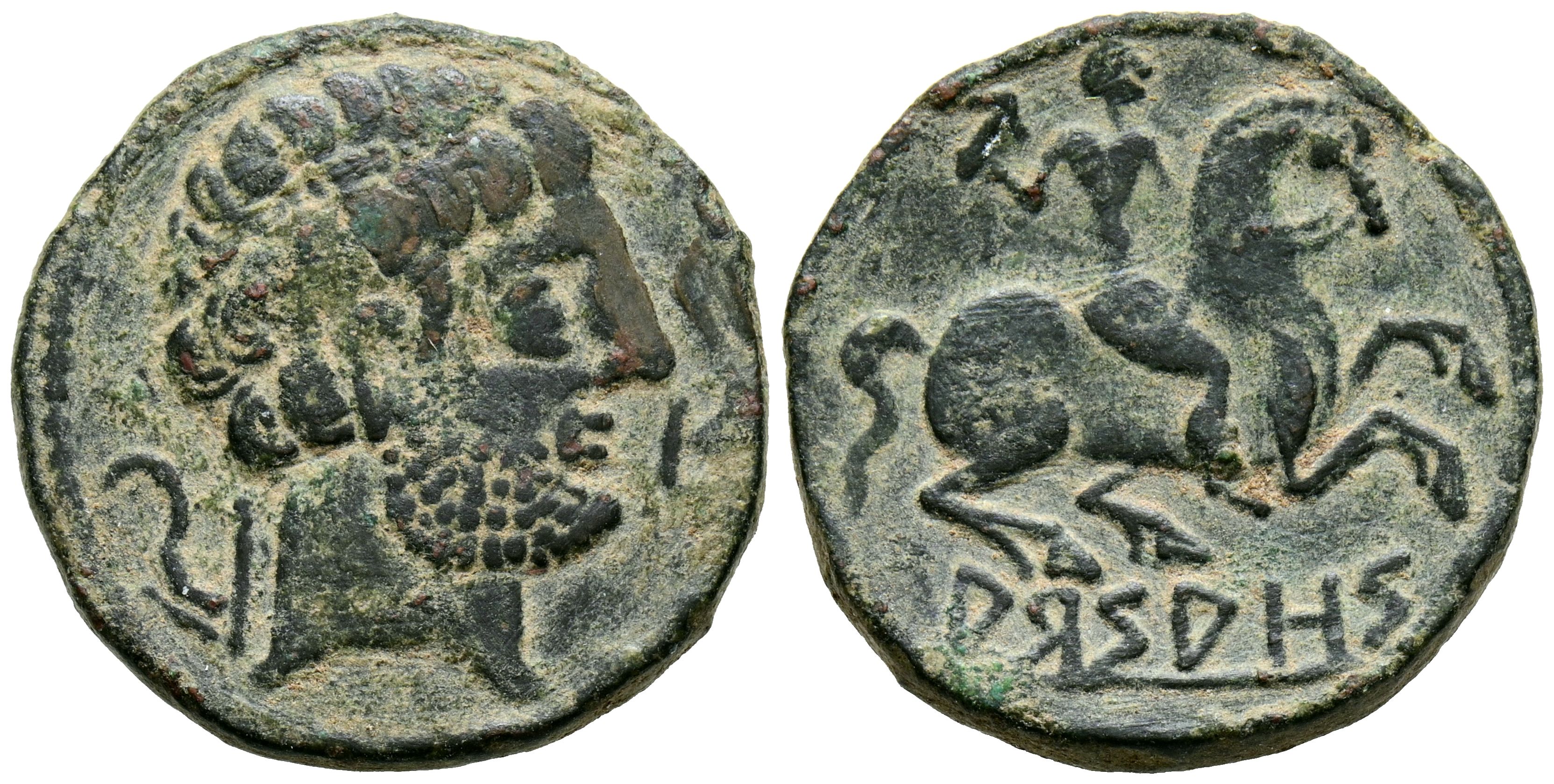 ARSAOS (Area de Navarra). As. (Ae. 8,07g/23mm). 120-80 a.C. (FAB-144). Anv: Cabeza masculina barbada a derecha, entre dos delfines. Rev: Jinete con dardo a derecha, debajo leyenda ibérica: ARSAOS. MBC/MBC+.