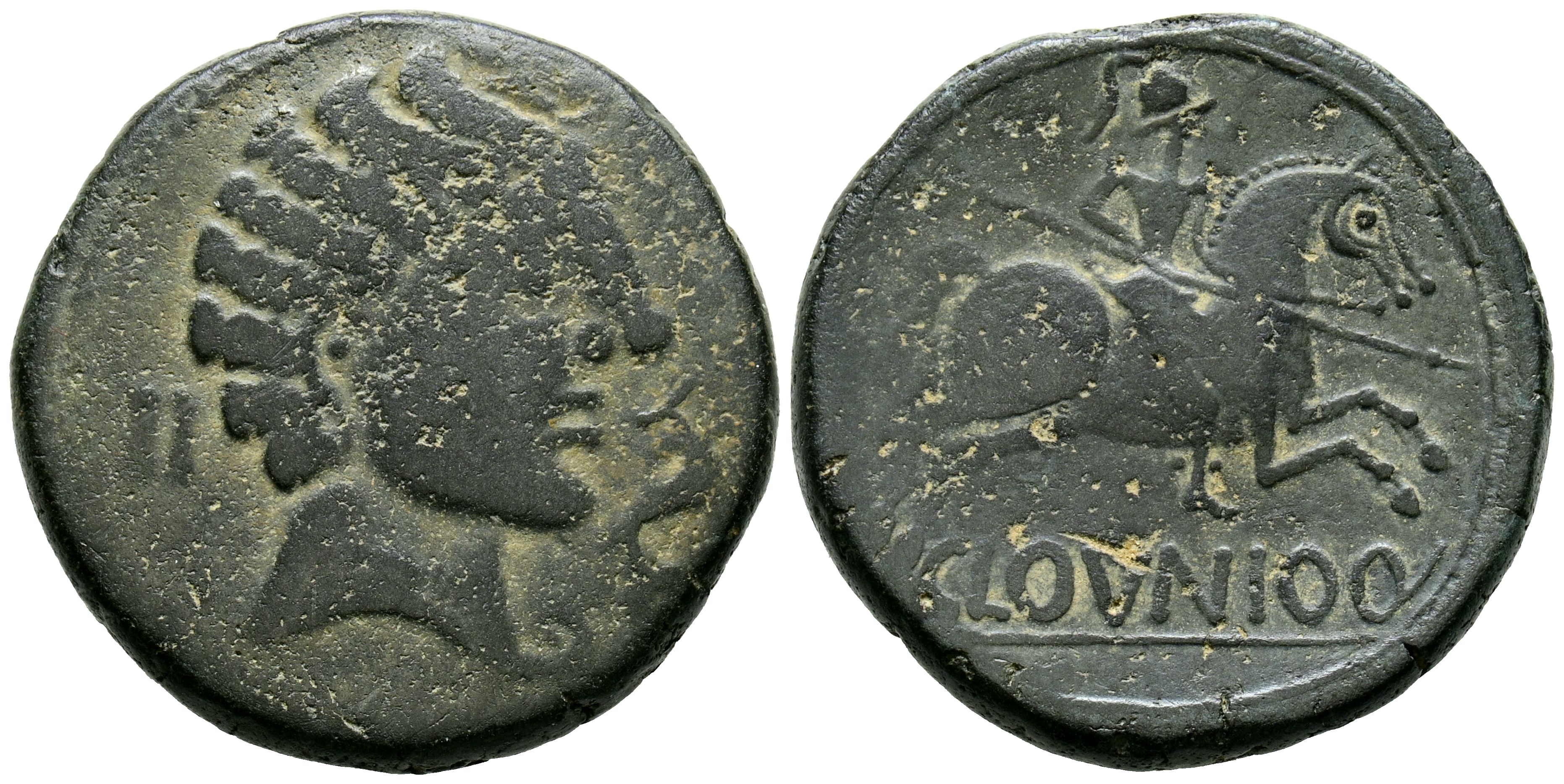 CLUNIA (Coruña del Conde, Burgos). As. (Ae. 12,04g/26mm). 40-20 a.C. (FAB-834). Anv: Cabeza masculina a derecha delante delfín y detrás signos: II. Rev: Jinete con lanza a derecha, debajo leyenda sobre línea: CLOVNIOQ. BC+/MBC-.