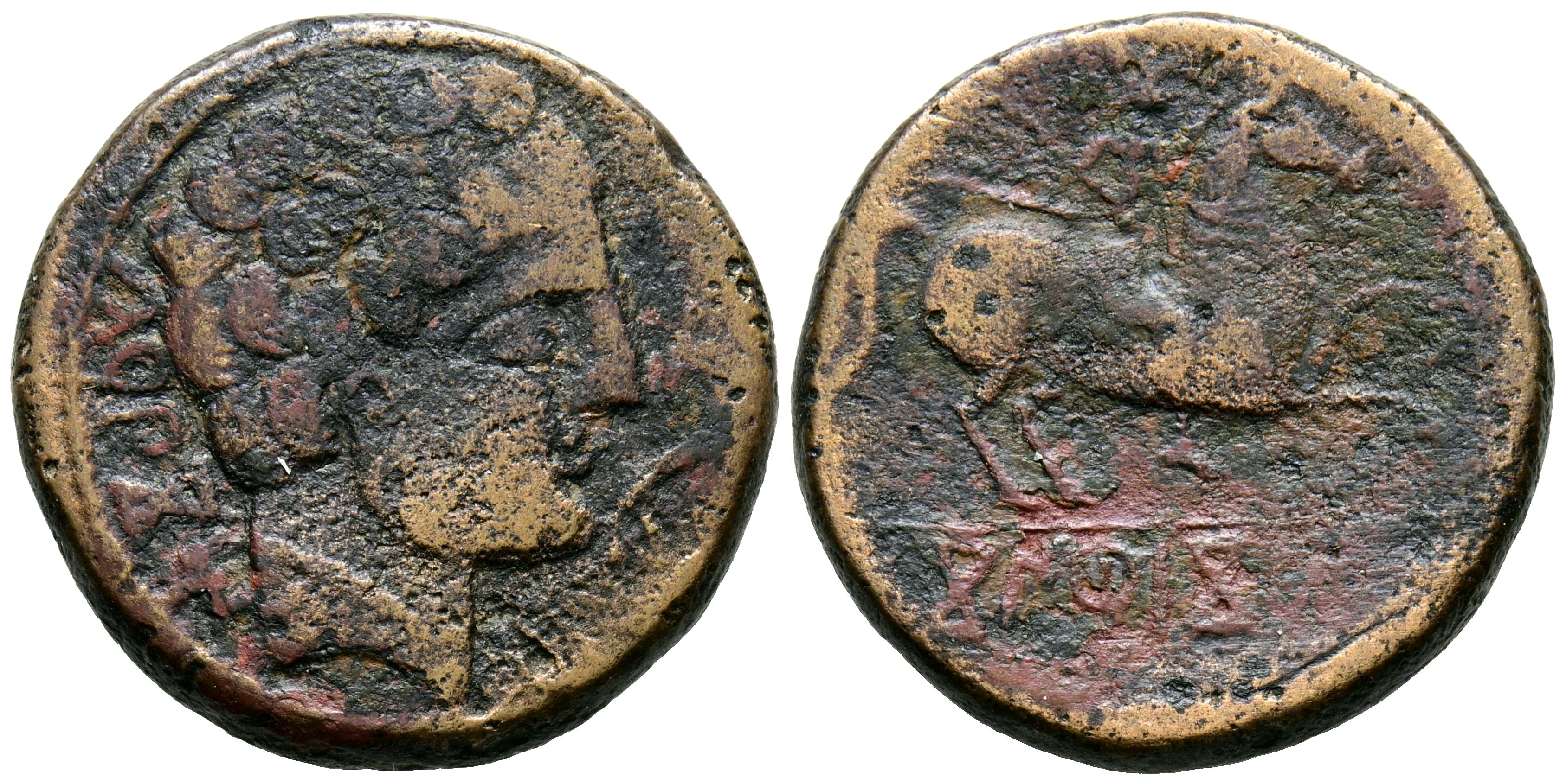 CONTERBIA CARBICA (Huete, Cuenca). As. (Ae. 8,95g/24mm). 120-80 a.C. (FAB-846). Anv: Cabeza masculina a derecha, detrás leyenda: CaRBiCa, delante delfín. Rev: Jinete con lanza a derecha, debajo leyenda ibérica bajo línea: CoNTeBaCoM. BC+.