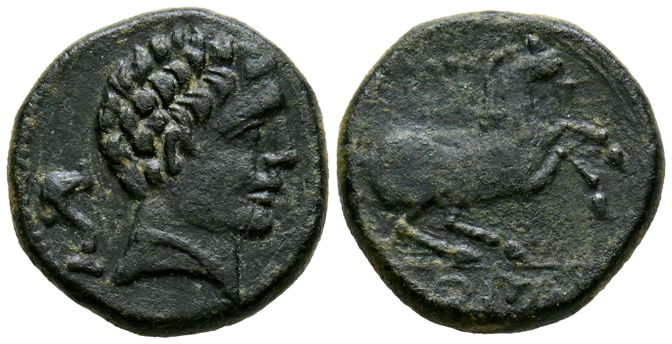 CONTERBIA CARBICA (Huete, Cuenca). Cuadrante. (Ae. 3,80g/16mm). 120-80 a.C. (FAB-860). Anv: Cabeza masculina a derecha, detrás delfín. Rev: Caballo a derecha, encima tres puntos, debajo leyenda ibérica bajo línea: CaRBiCa. MBC+/MBC.