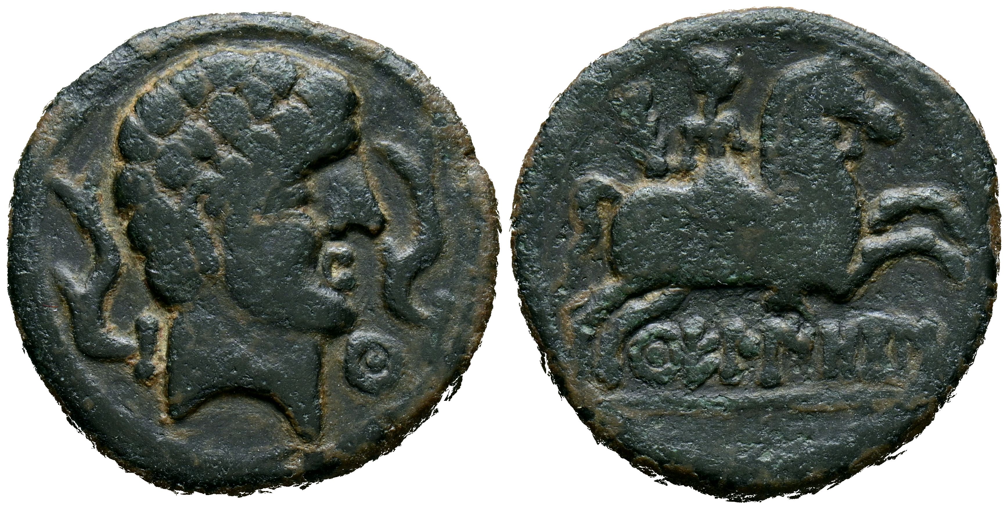CUELIOCOS (Zona alta del Ebro). As. (Ae. 10,22g/24mm). 120-20 a.C. (FAB-870). Anv: Cabeza masculina a derecha, delante letra ibérica Cu, entre dos delfines. Rev: Jinete con palma a derecha, debajo leyenda ibérica: CuELIOCoS. MBC.