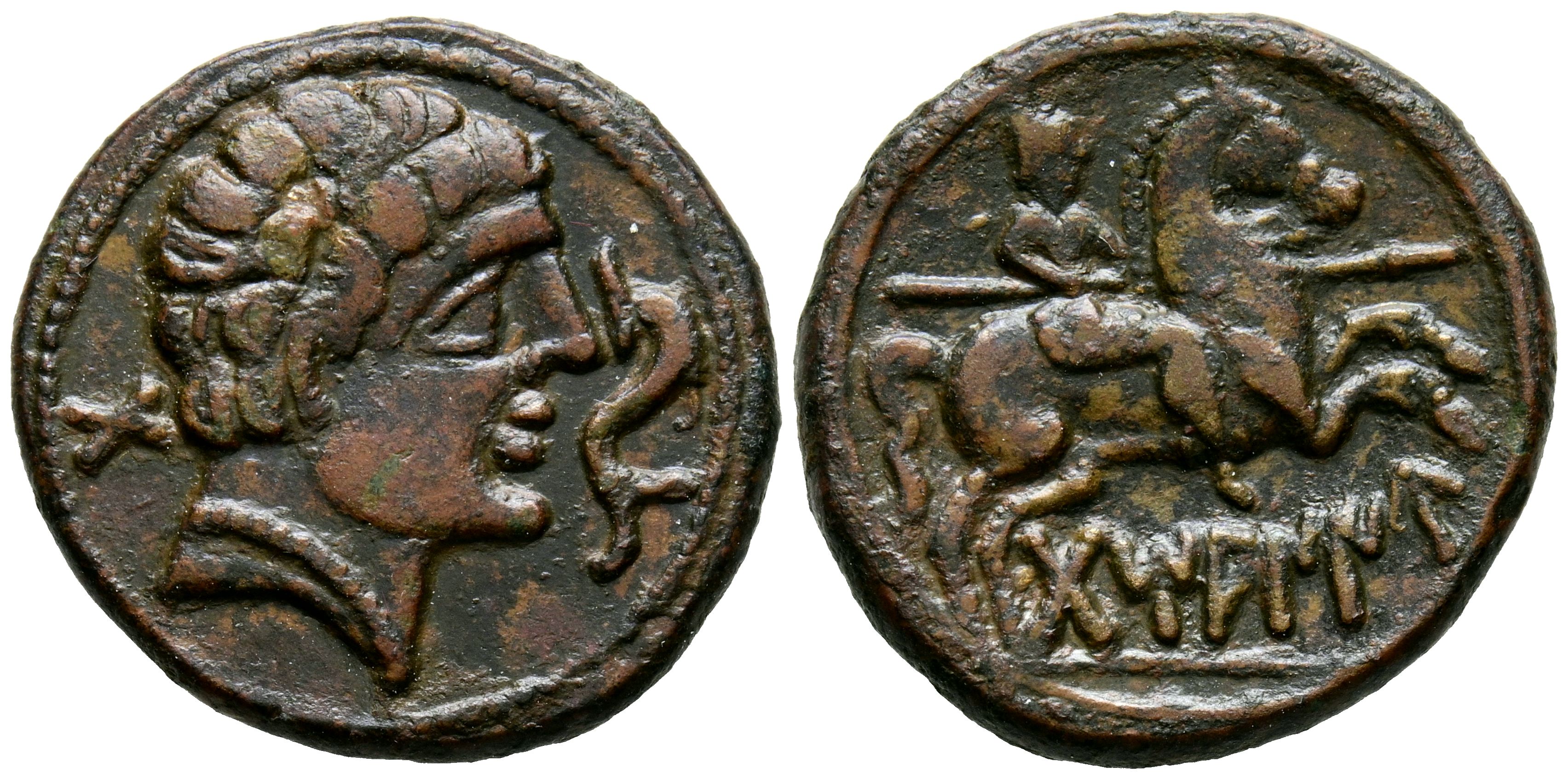 DAMANIU (Zona de Aragón). As. (Ae. 8,87g/24mm). 120-20 a.C. (FAB-890). Anv: Cabeza masculina a derecha, detrás X, delante delfín. Rev: Jinete con lanza a derecha, detrás leyenda ibérica: DaMANIU. EBC-. Escaso y más así con esta bonita pátina.