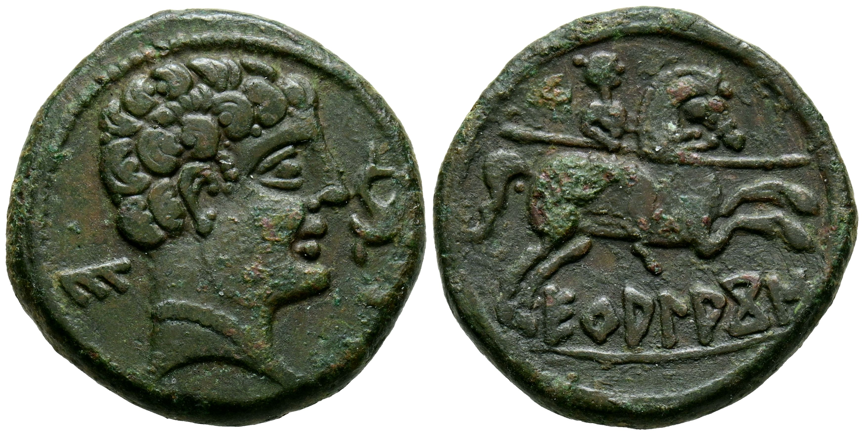ECUALACOS (Zona de Soria-Guadalajara). As. (Ae. 10,57g/24mm). 120-20 a.C. (FAB-969). Anv: Cabeza masculina a derecha, delante delfín, detrás letra ibérica: E. Rev: Jinete con lanza a derecha, debajo leyenda: ECuALACoS. MBC+.