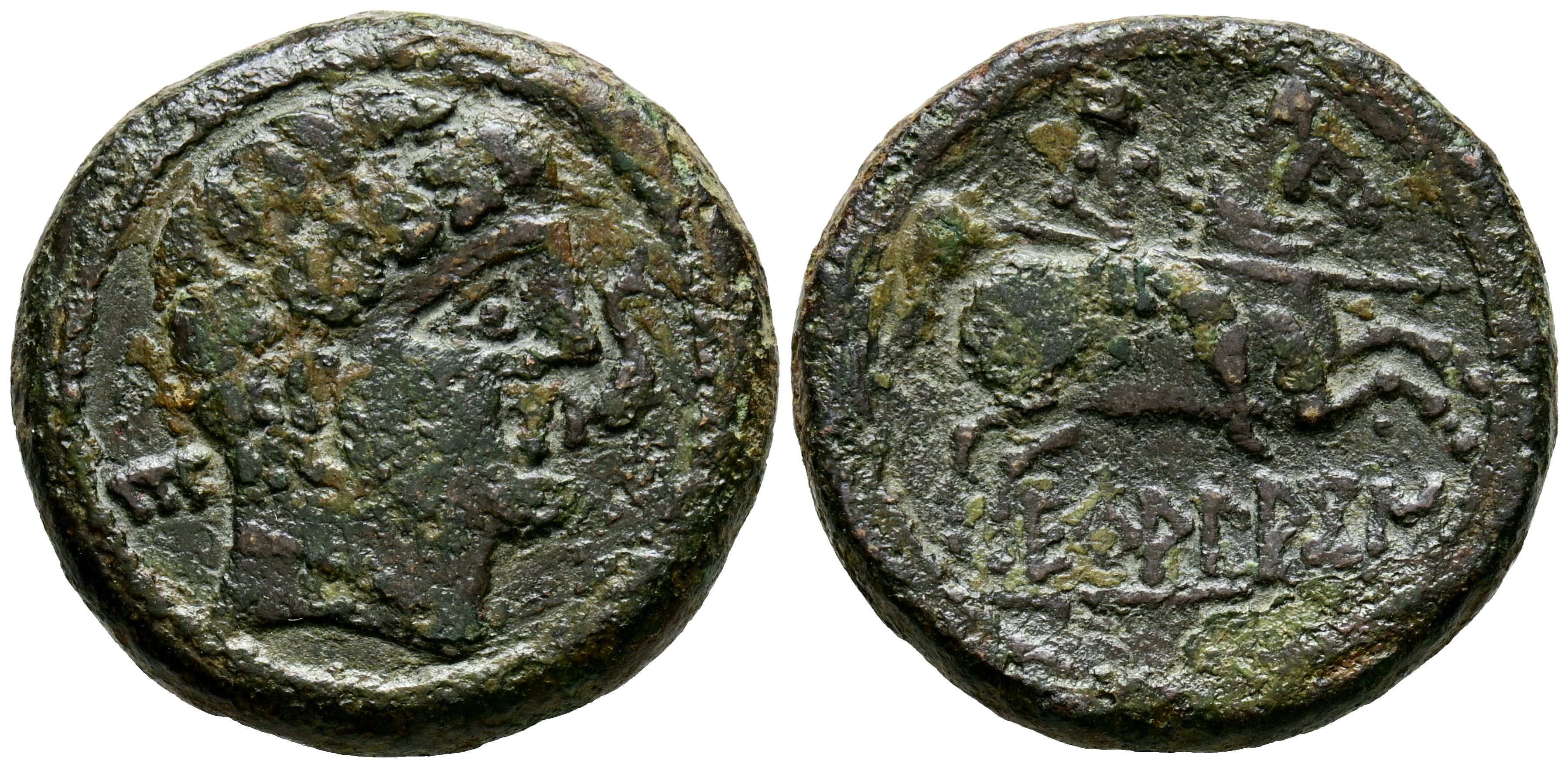 ECUALACOS (Zona de Soria-Guadalajara). As. (Ae. 12,43g/25mm). 120-20 a.C. (FAB-969). Anv: Cabeza masculina a derecha, delante delfín, detrás letra ibérica: E. Rev: Jinete con lanza a derecha, debajo leyenda: ECuALACoS. MBC-.