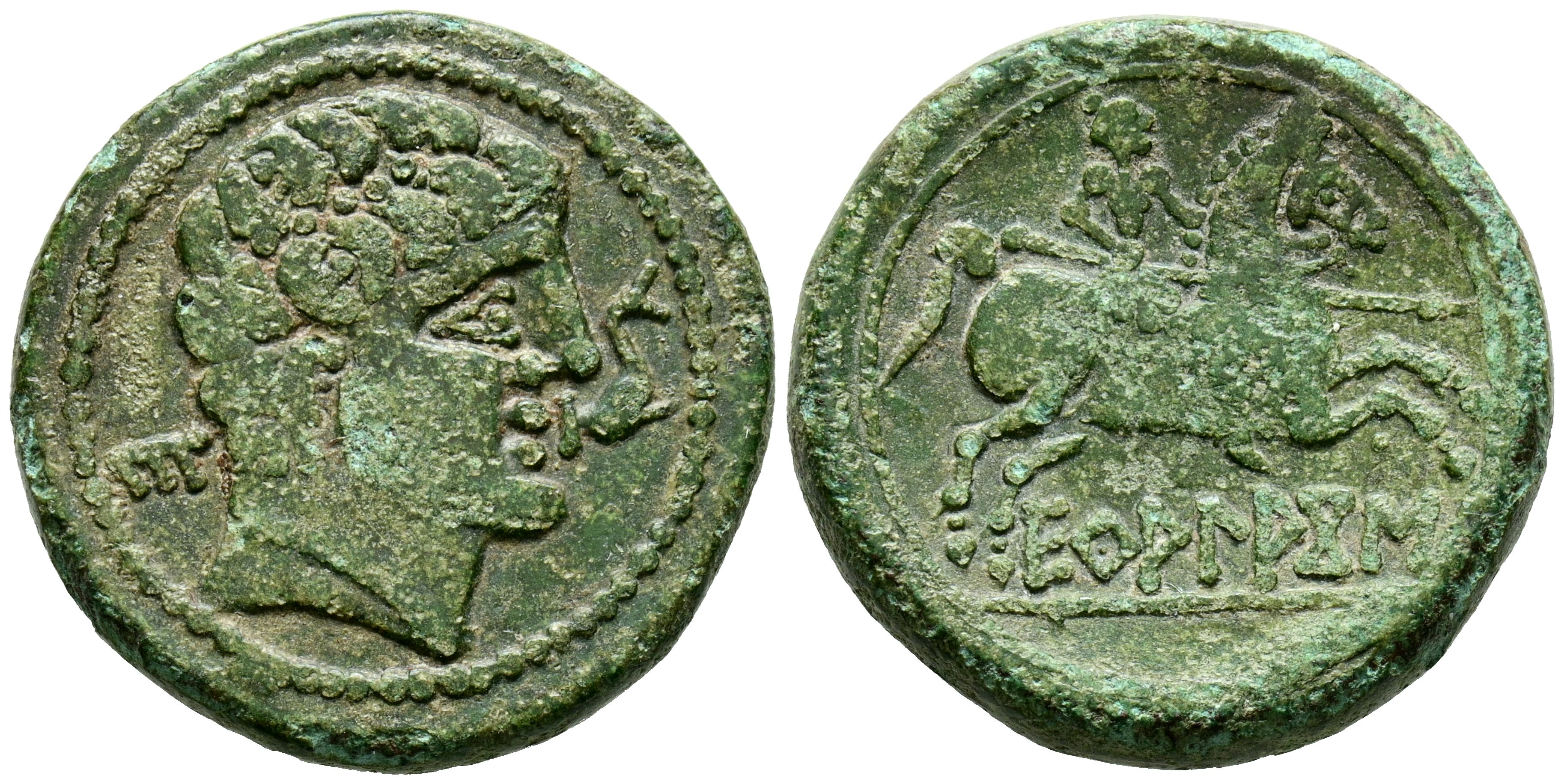 ECUALACOS (Zona de Soria-Guadalajara). As. (Ae. 11,99g/25mm). 120-20 a.C. (FAB-969). Anv: Cabeza masculina a derecha, delante delfín, detrás letra ibérica: E. Rev: Jinete con lanza a derecha, debajo leyenda: ECuALACoS. MBC.