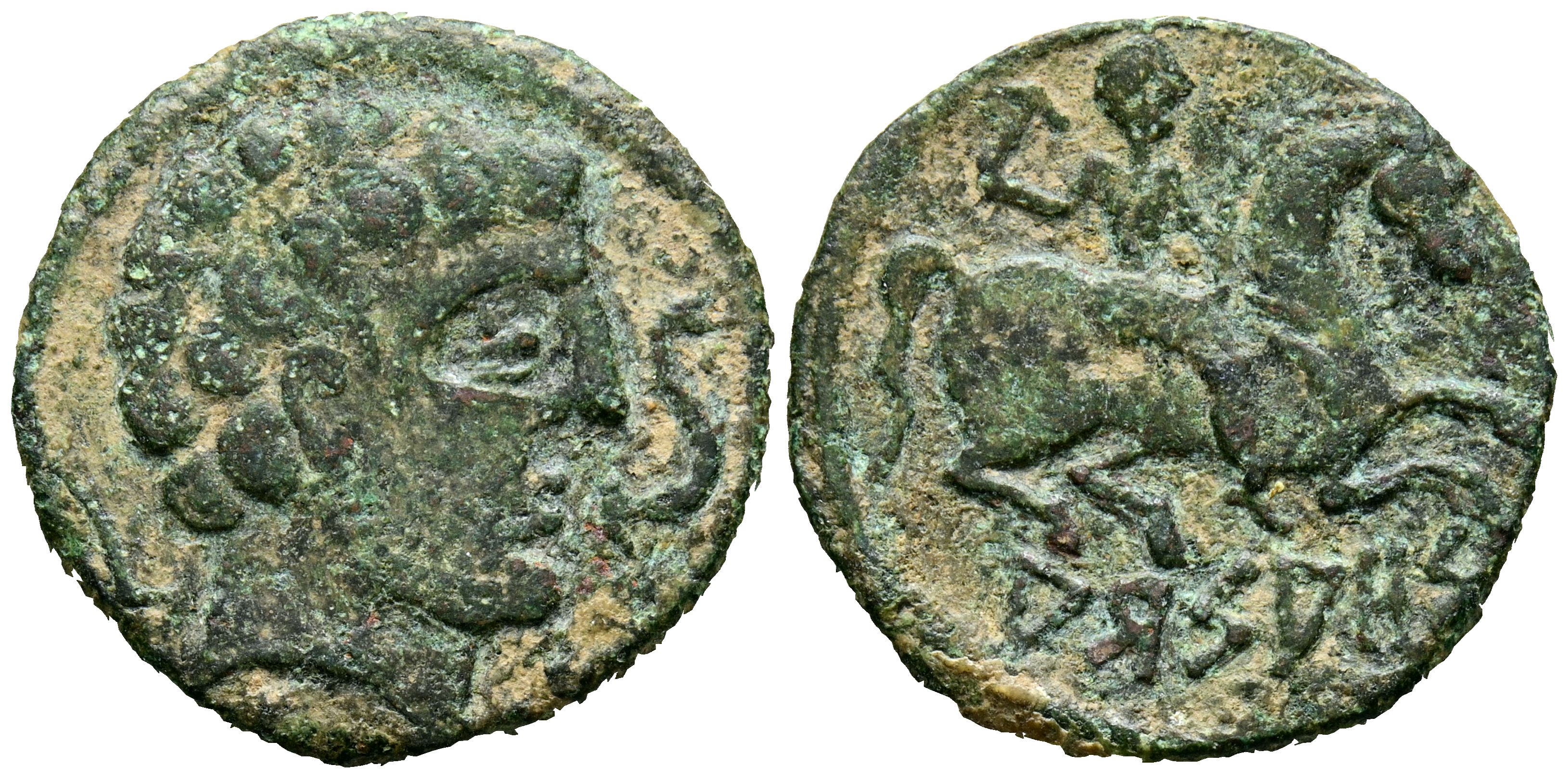 ARSAOS (Area de Navarra). As. (Ae. 8,34g/23mm). 120-80 a.C. (FAB-144). Anv: Cabeza masculina barbada a derecha, entre dos delfines. Rev: Jinete con dardo a derecha, debajo leyenda ibérica: ARSAOS. MBC-.