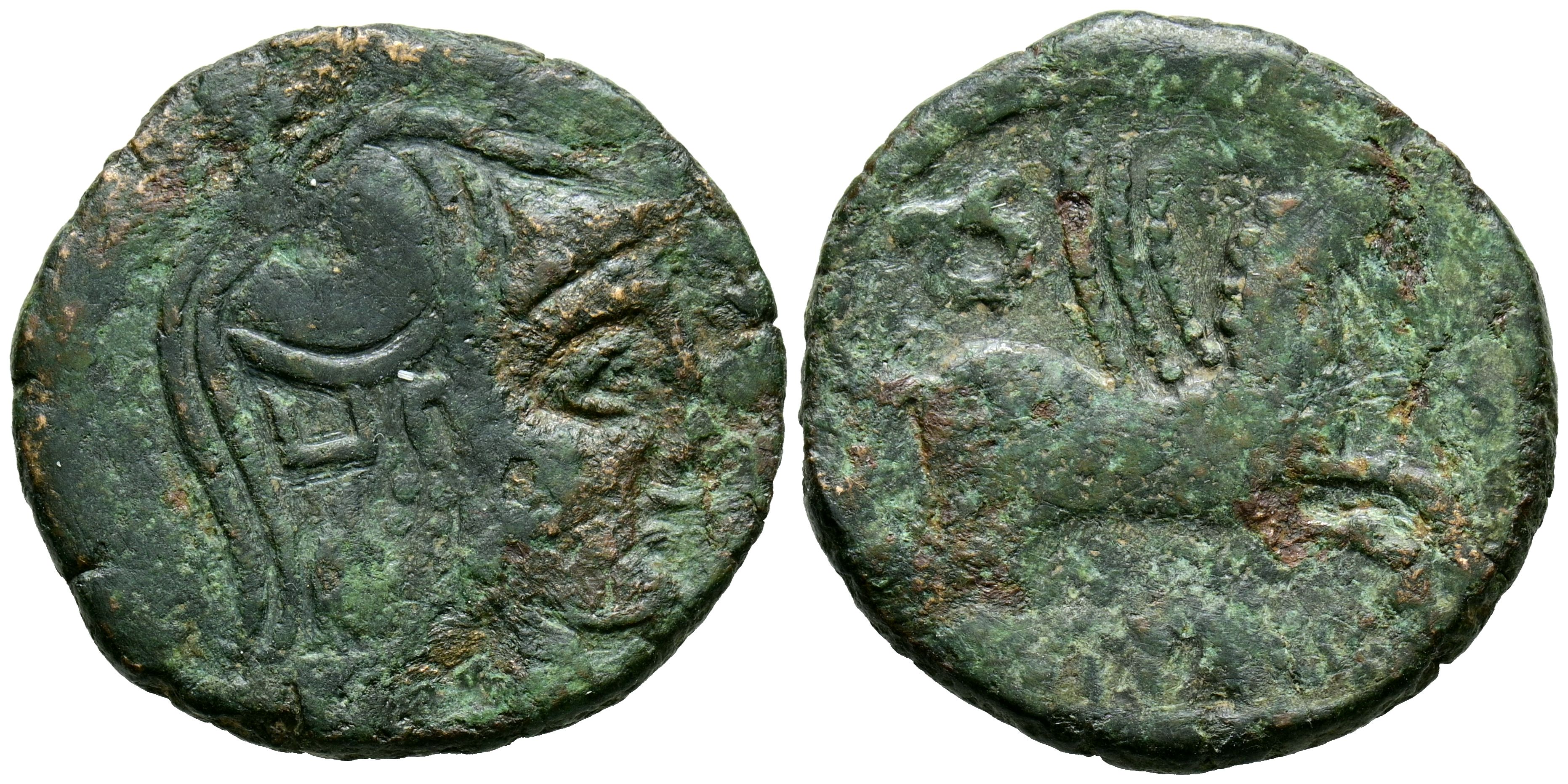 UNTICESCEN (Ampurias, Gerona). As. (Ae. 9,99g/26mm). 130-90 a.C. (FAB-1210). Anv: Cabeza de Palas a derecha delante letr ibérica: E. Rev: Pegaso-Criasor a derecha, encima corona de laurel, debajo leyenda ibérica sobre línea: UNTiCeSCeN. MBC-.