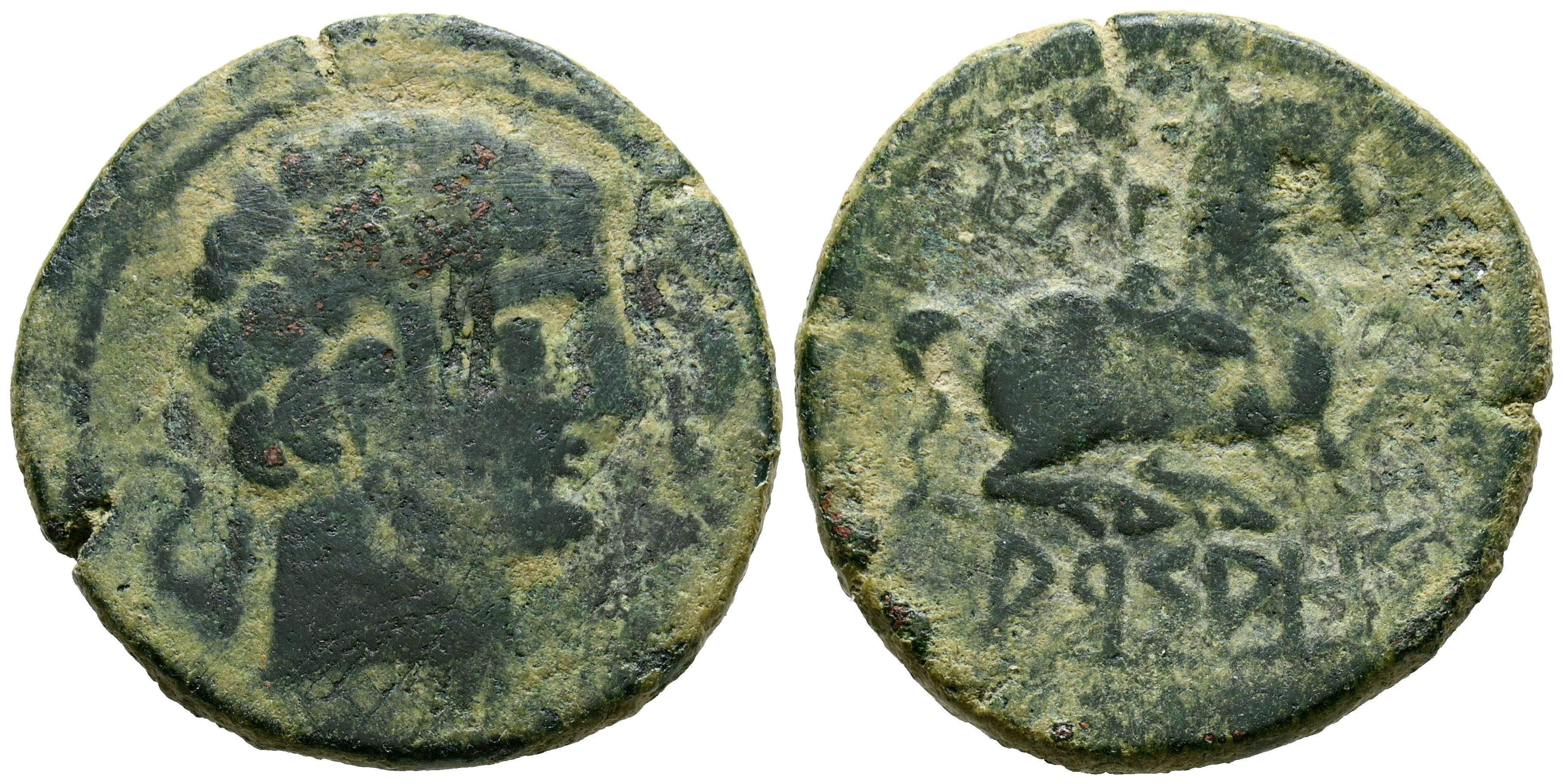 ARSAOS (Area de Navarra). As. (Ae. 8,57g/25mm). 120-80 a.C. (FAB-144). Anv: Cabeza masculina barbada a derecha, entre dos delfines. Rev: Jinete con dardo a derecha, debajo leyenda ibérica: ARSAOS. MBC-.