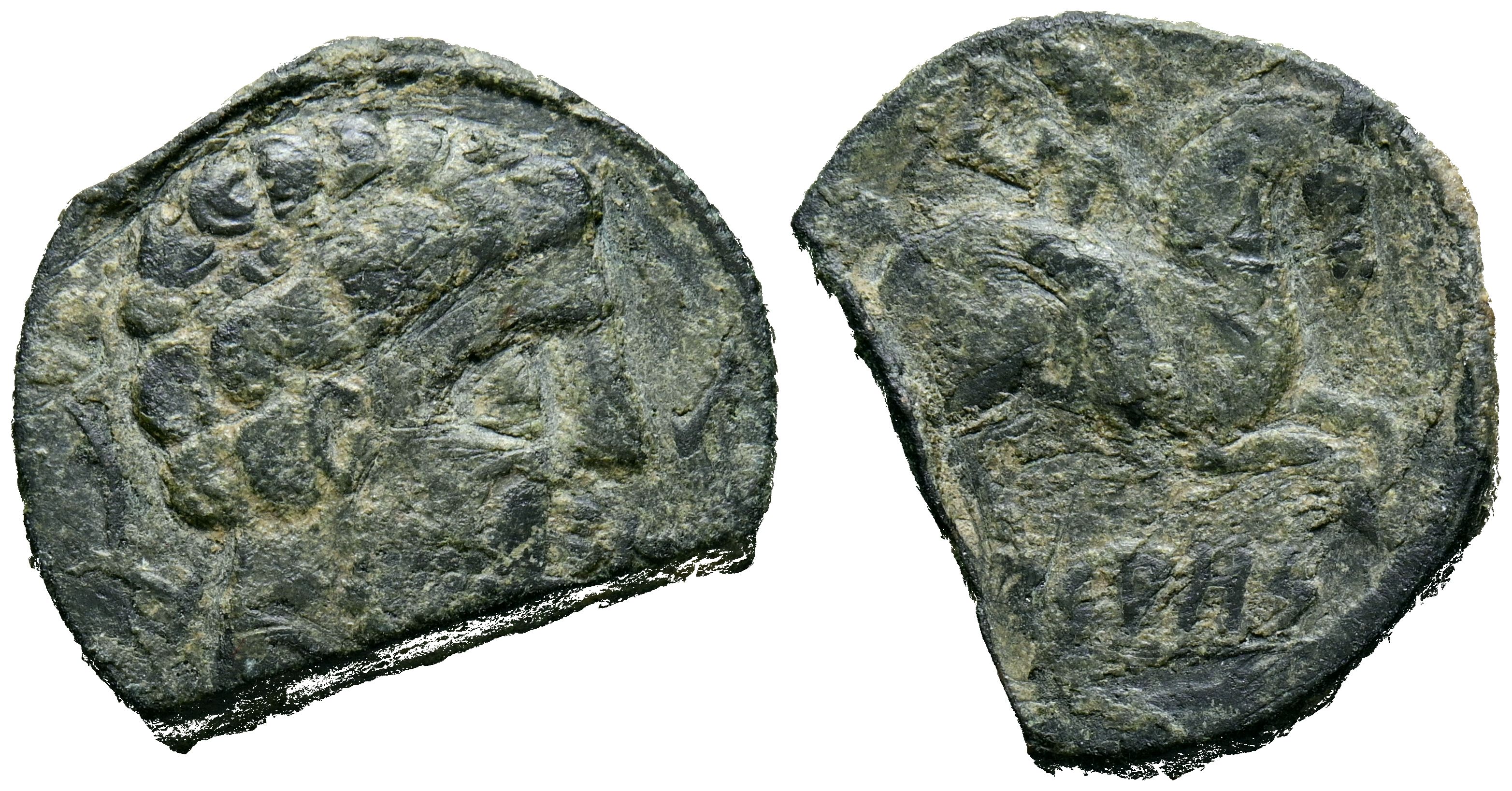 ARSAOS (Zona de Navarra). As. (Ae. 7,00g/23mm). 120-80 a.C. (FAB-144). Anv: Cabeza masculina y barbada a derecha entre dos delfines. Rev: Jinete con dardo a derecha, debajo de línea leyenda: ARSAOS. MBC-. Recortada.