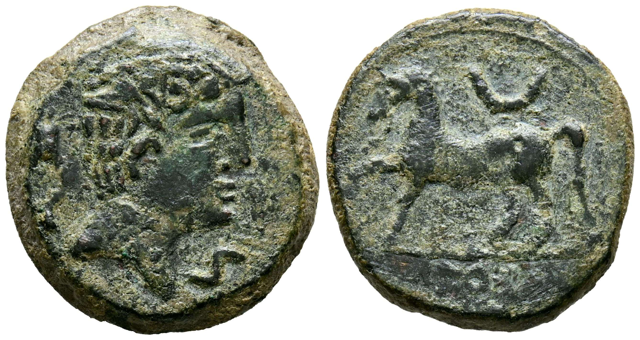 ICALCUSCEN (Iniesta, Cuenca). Semis. (Ae. 4,93g/20mm). 120-20 a.C. (FAB-1401). Anv: Cabeza masculina a derecha, entre delfines. Rev: Caballo a izquierda sobre línea, encima estrella sobre creciente, debajo leyenda ibérica: ICaLCuSCeN. MBC+/MBC. Escaso.
