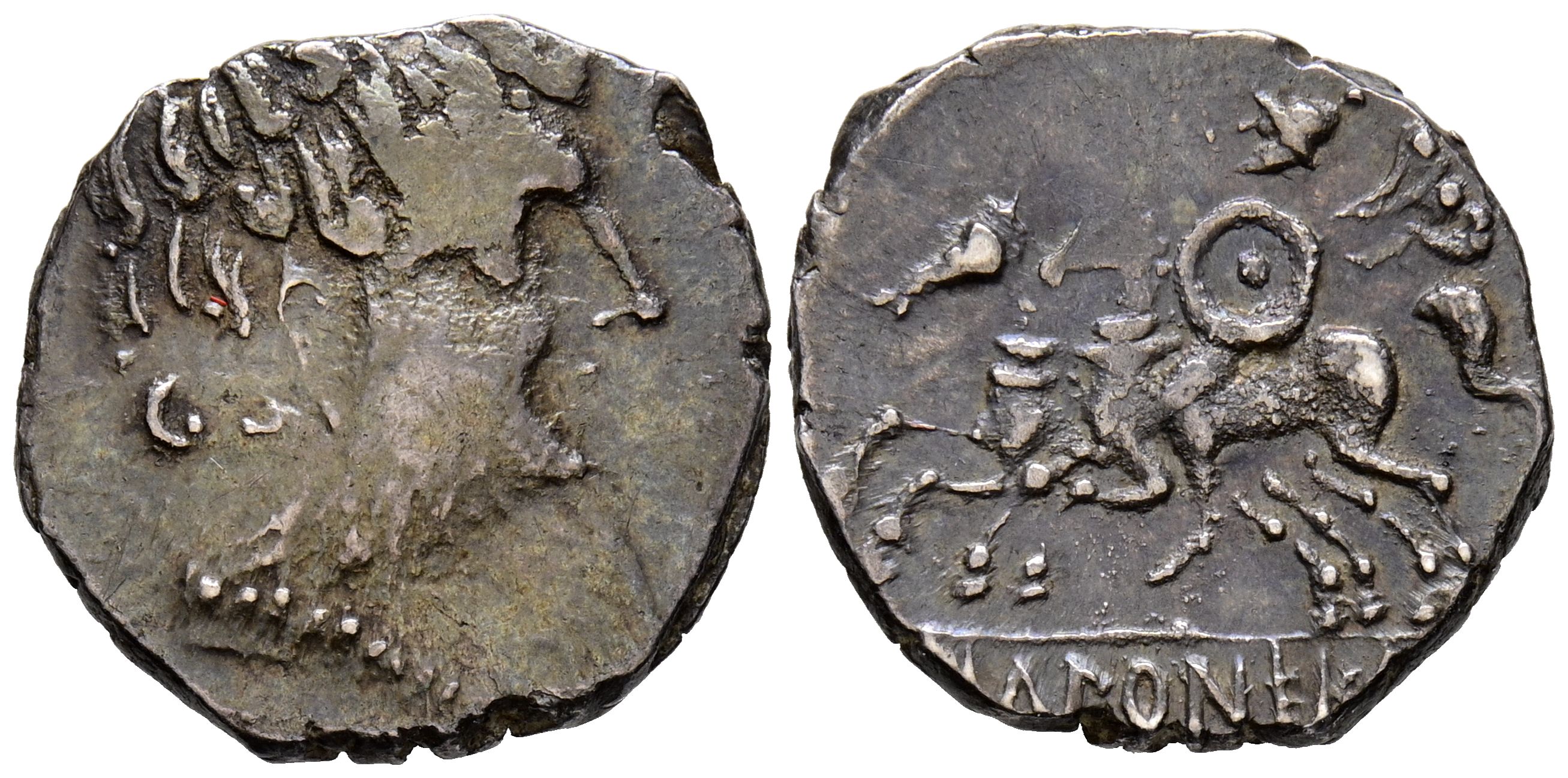 ICALCUNSCEN (Iniesta, Cuenca). Denario. (Ar. 3,70g/19mm). 120-20 a.C. (FAB-1402). Anv: Cabeza masculina a derecha. Rev: Jinete con lanza y escudo sobre dos caballos a izquierda, debajo leyenda ibérica bajo línea: ICaLCuNSCeN. MBC-. Cospel faltado.