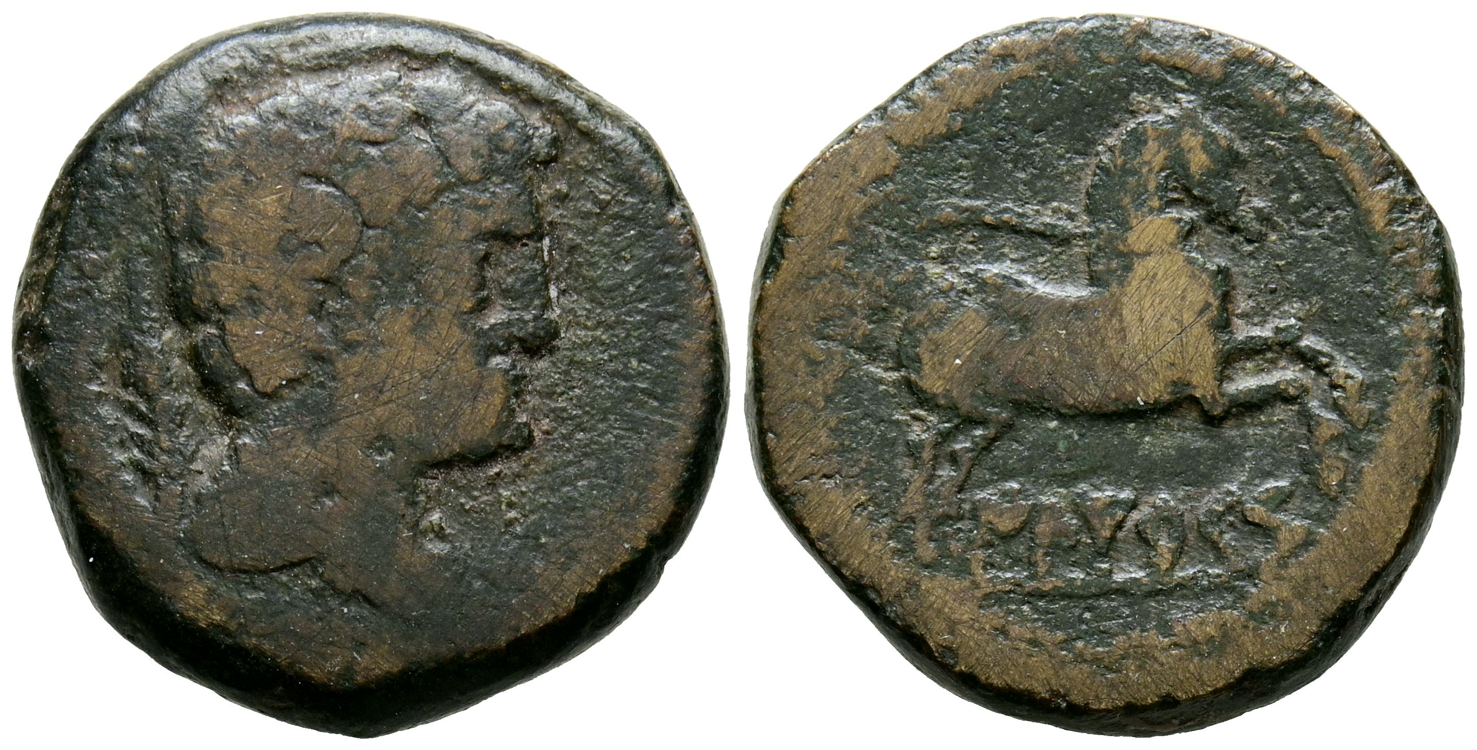 ILTIRCES (Zona de Solsona, Lérida). Semis. (Ae. 3,90g/21mm). 200-180 a.C. (FAB-1454). Anv: Cabeza masculina a derecha, detrás palma. Rev: Caballo a derecha, debajo leyenda ibérica: ILTiRCeS. MBC-.