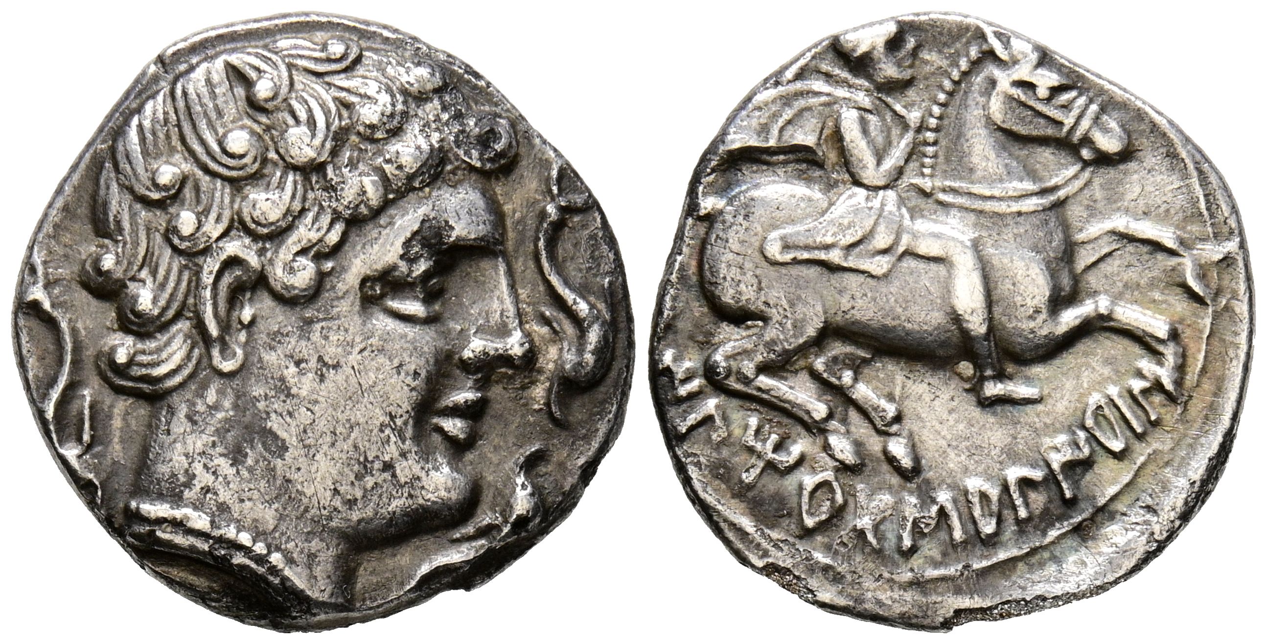ILTIRTASALIRBAN (Lérida). Denario. (Ar. 3,75g/18mm). 200-20 a.C. (FAB-1455). Anv: Cabeza masculina a derecha rodeada de tres delfines. Rev: Jinete con palma a derecha, debajo leyenda ibérica: ILTiRTaSALIRBaN. EBC-. Bonito y escaso ejemplar. Ex J.A. Herrero (12/12/2007), Nº Lote 289.