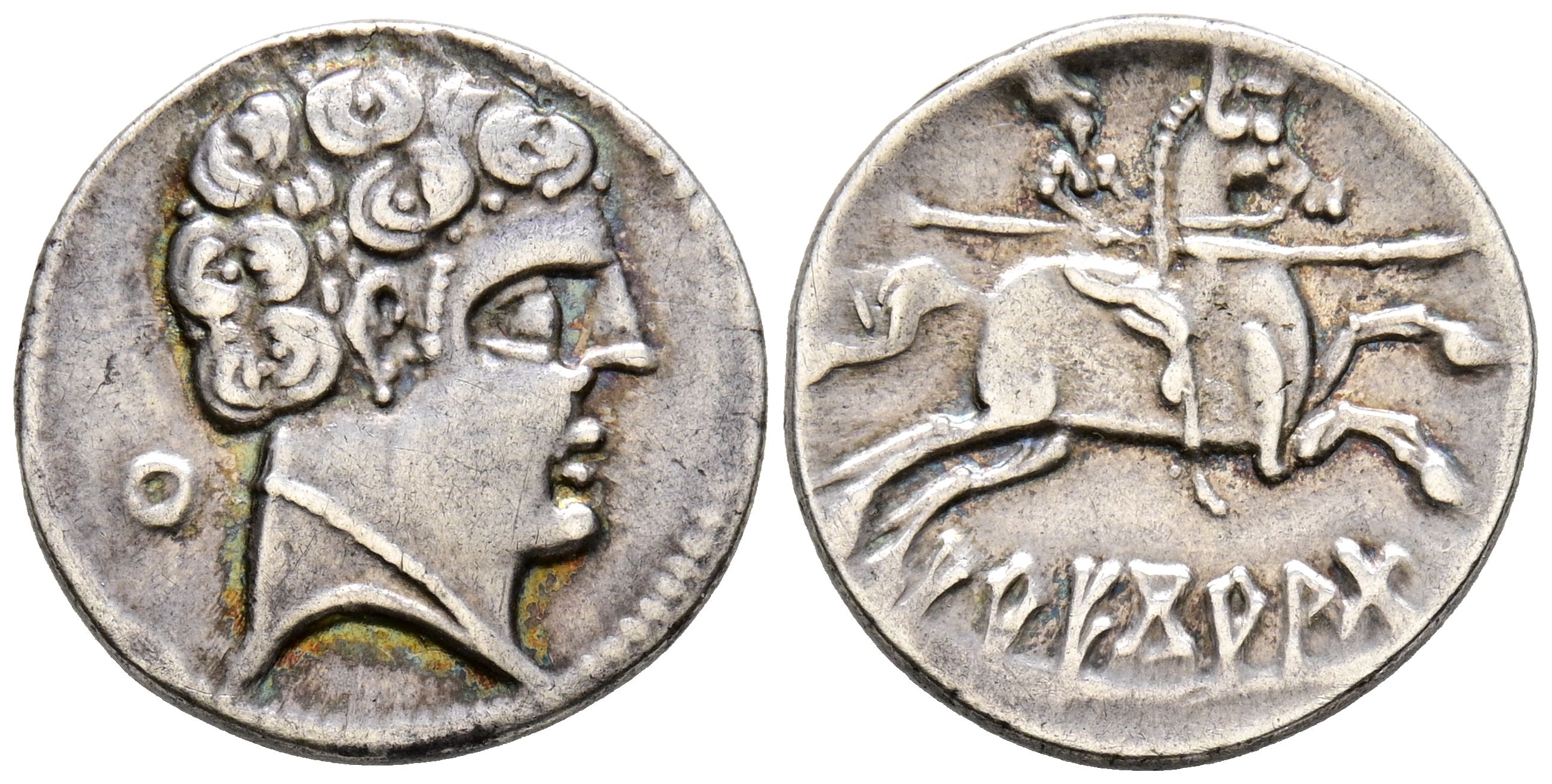 ARECORATAS (Agreda, Soria). Denario. (Ar. 3,41g/18mm). 150-20 a.C. (FAB-105). Anv: Cabeza masculina a derecha, detrás leyenda ibérica: Cu. Rev: Jinete con lanza a derecha, debajo leyenda ibérica sobre línea: ARECoRATaS. MBC+.