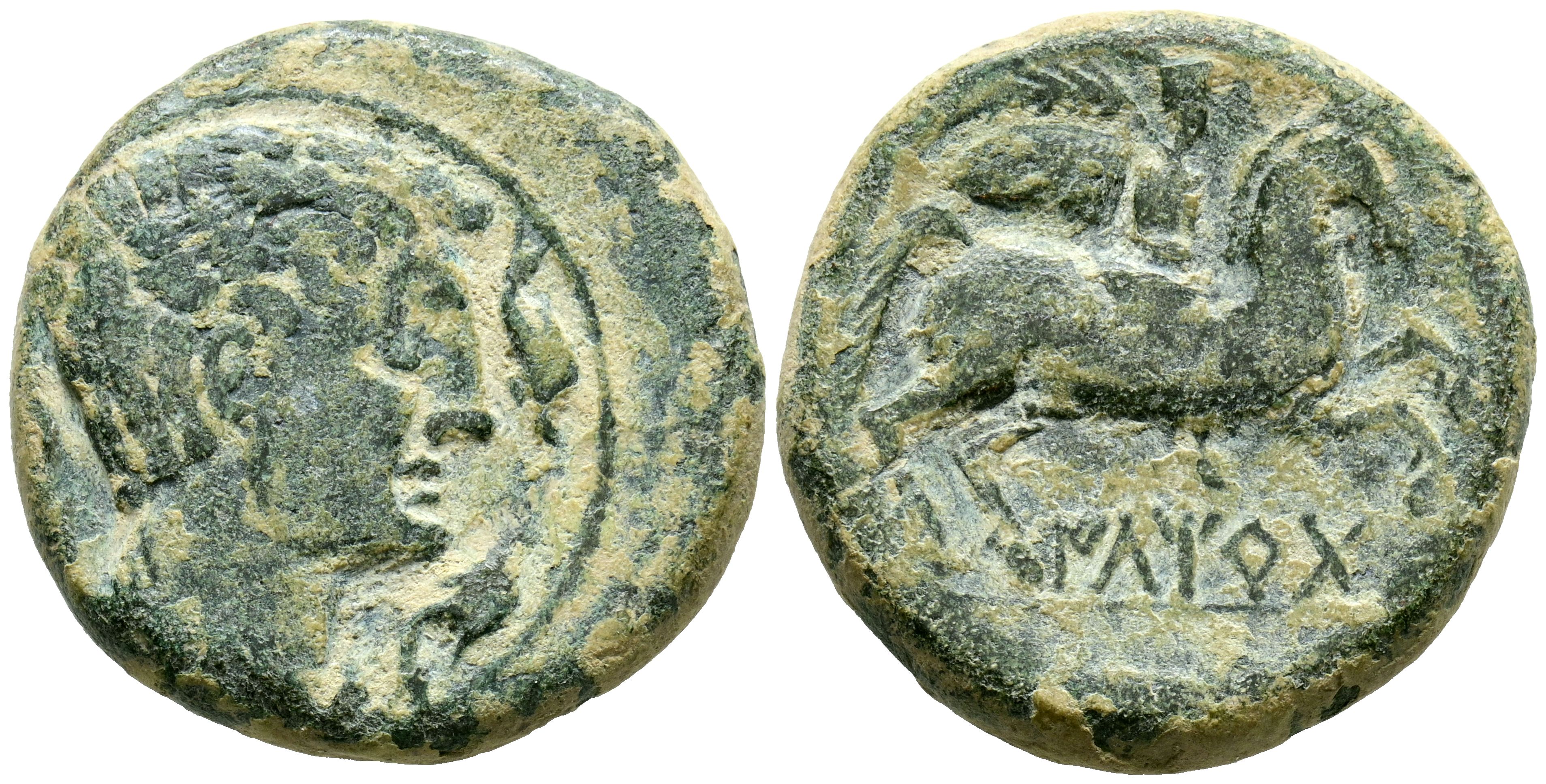 ILTIRTA (Lérida). As. (Ae. 16,32g/27mm). 200-20 a.C. (FAB-1465). Anv: Cabeza masculina a derecha, alrededor tres delfines. Rev: Jinete con palma a derecha, debajo leyenda ibérica: ILTiRTa. MBC-.