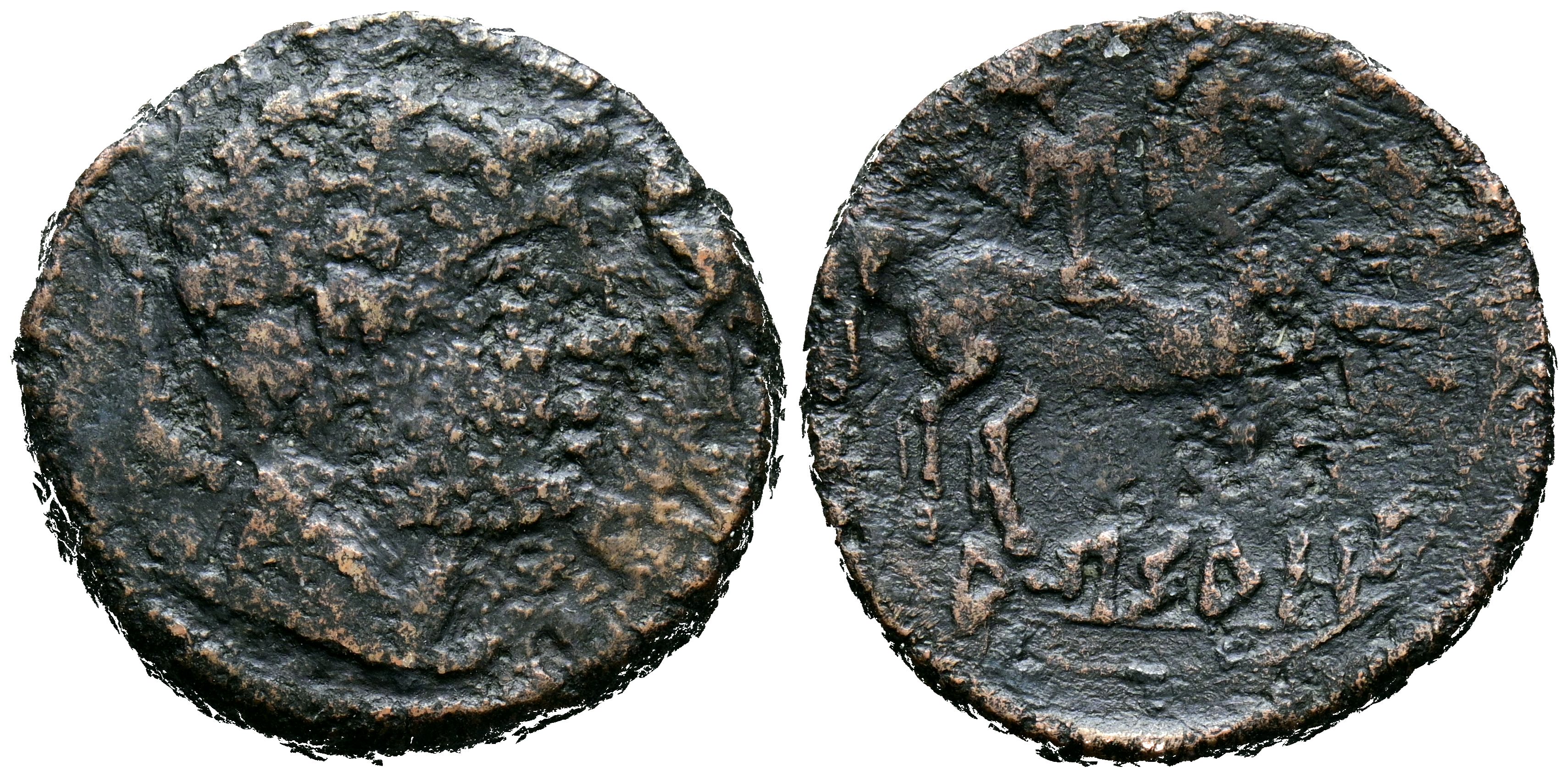ARSAOS (Area de Navarra). As. (Ae. 9,50g/24mm). 120-80 a.C. (FAB-144). Anv: Cabeza masculina barbada a derecha, entre dos delfines. Rev: Jinete con dardo a derecha, debajo leyenda ibérica: ARSAOS. BC+.