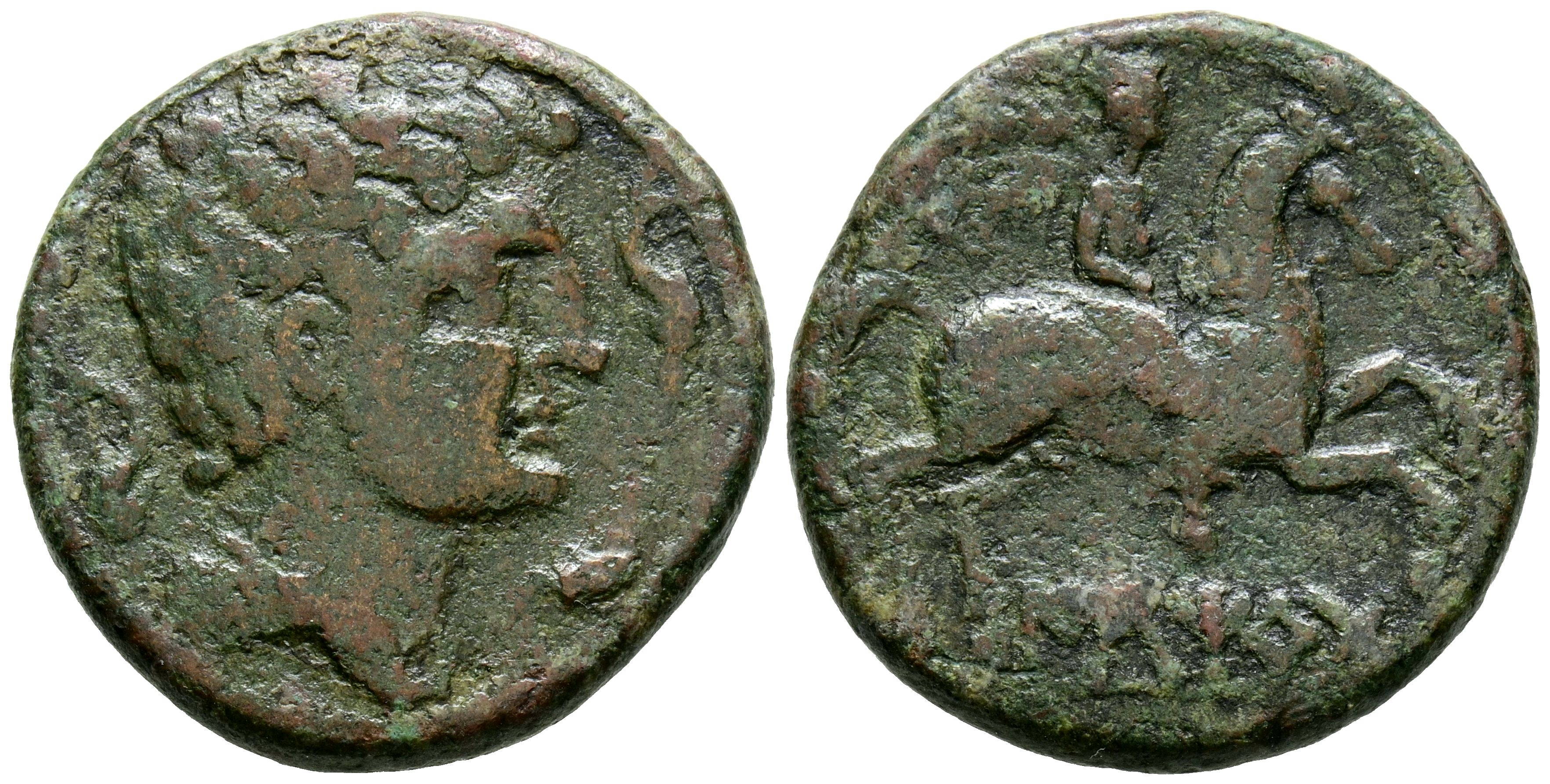 ILTIRTA (Lérida). As. (Ae. 10,96g/25mm). 200-20 a.C. (FAB-1465). Anv: Cabeza masculina a derecha, alrededor tres delfines. Rev: Jinete con palma a derecha, debajo leyenda ibérica: ILTiRTa. BC+.