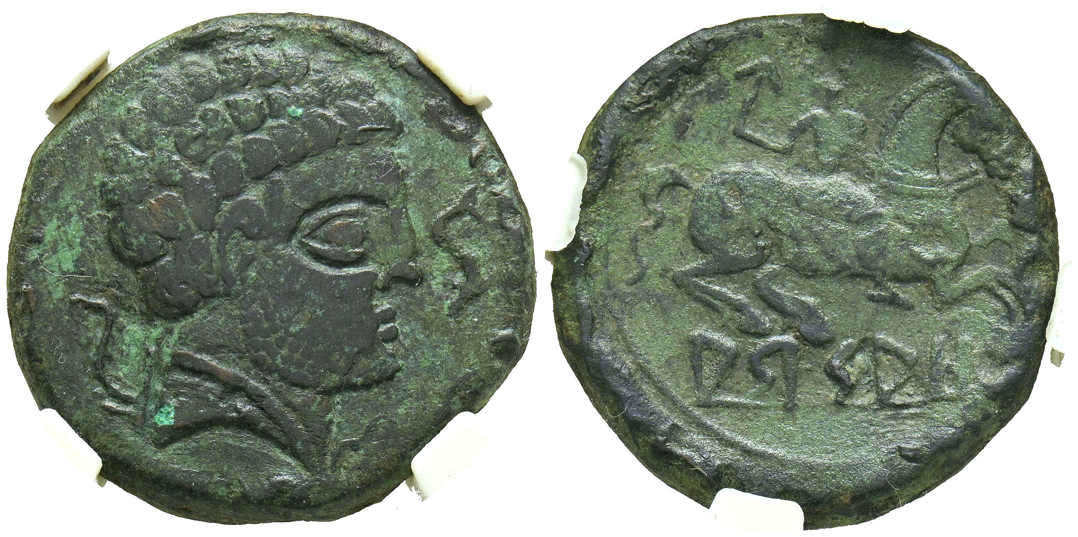 ARSAOS (Zona de Navarra). As. (Ae. 12,29g/25mm). 120-80 a.C. (FAB-144). Anv: Cabeza masculina barbada a derecha, entre dos delfines. Rev: Jinete con dardo a derecha, debajo leyenda ibérica: ARSAOS. Encapsulado por NCV VF.