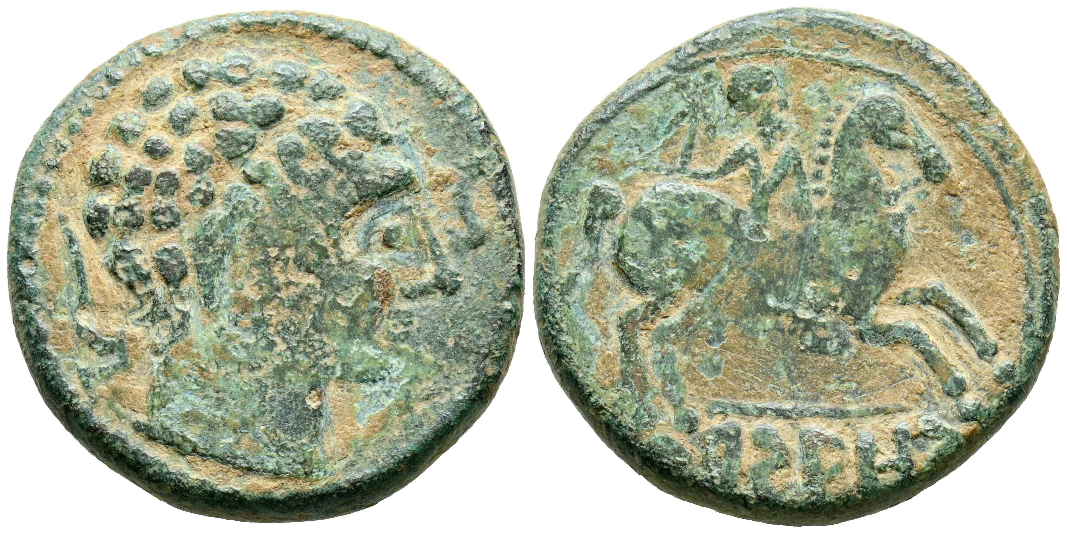 ARSAOS (Zona de Navarra). As. (Ae. 12,02g/26mm). 120-80 a.C. (FAB-145). Anv: Cabeza masculina y barbada a derecha entre dos delfines, arte degenerado. Rev: Jinete con dardo a derecha, debajo de línea leyenda: ARSAOS, arte degenerado. MBC-.