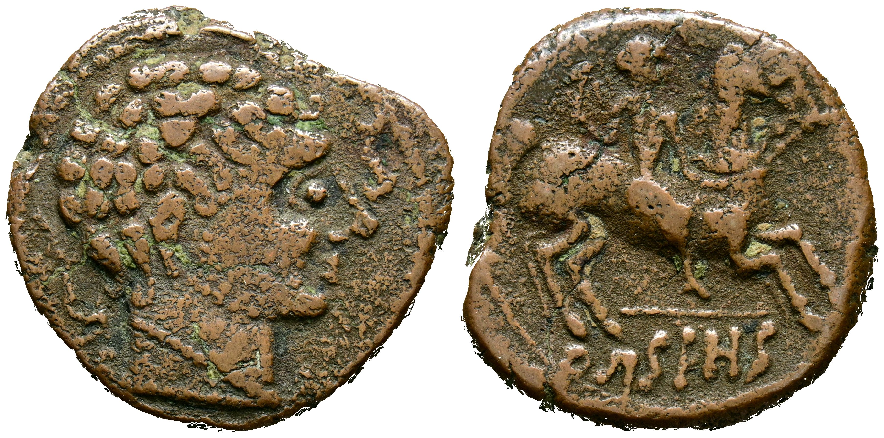 ARSAOS (Zona de Navarra). As. (Ae. 11,03g/26mm). 120-80 a.C. (FAB-145). Anv: Cabeza masculina y barbada a derecha entre dos delfines, arte degenerado. Rev: Jinete con dardo a derecha, debajo de línea leyenda: ARSAOS, arte degenerado. MBC.