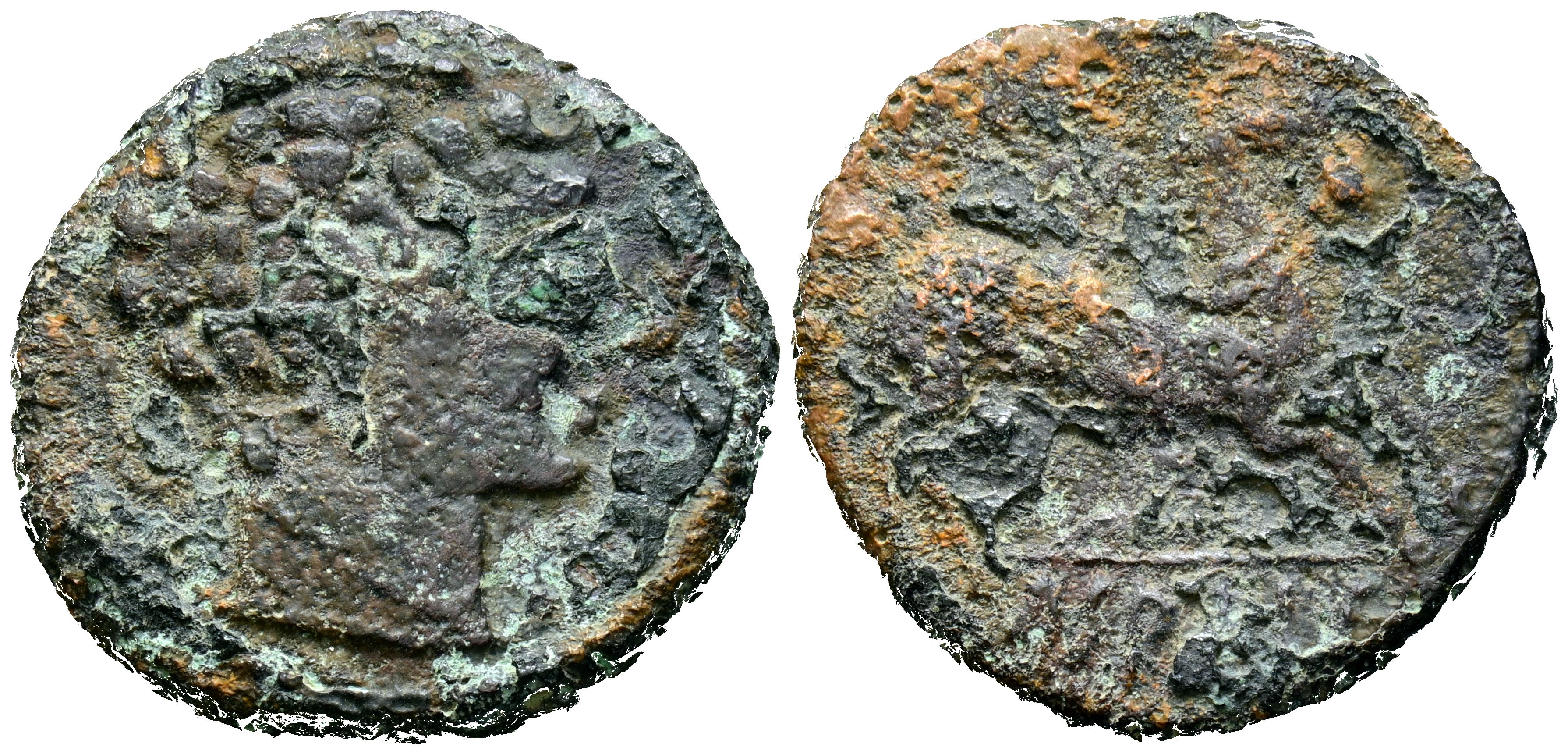 ARSAOS (Zona de Navarra). As. (Ae. 7,18g/22mm). 120-80 a.C. (FAB-145). Anv: Cabeza masculina y barbada a derecha entre dos delfines, arte degenerado. Rev: Jinete con dardo a derecha, debajo de línea leyenda: ARSAOS, arte degenerado. BC.