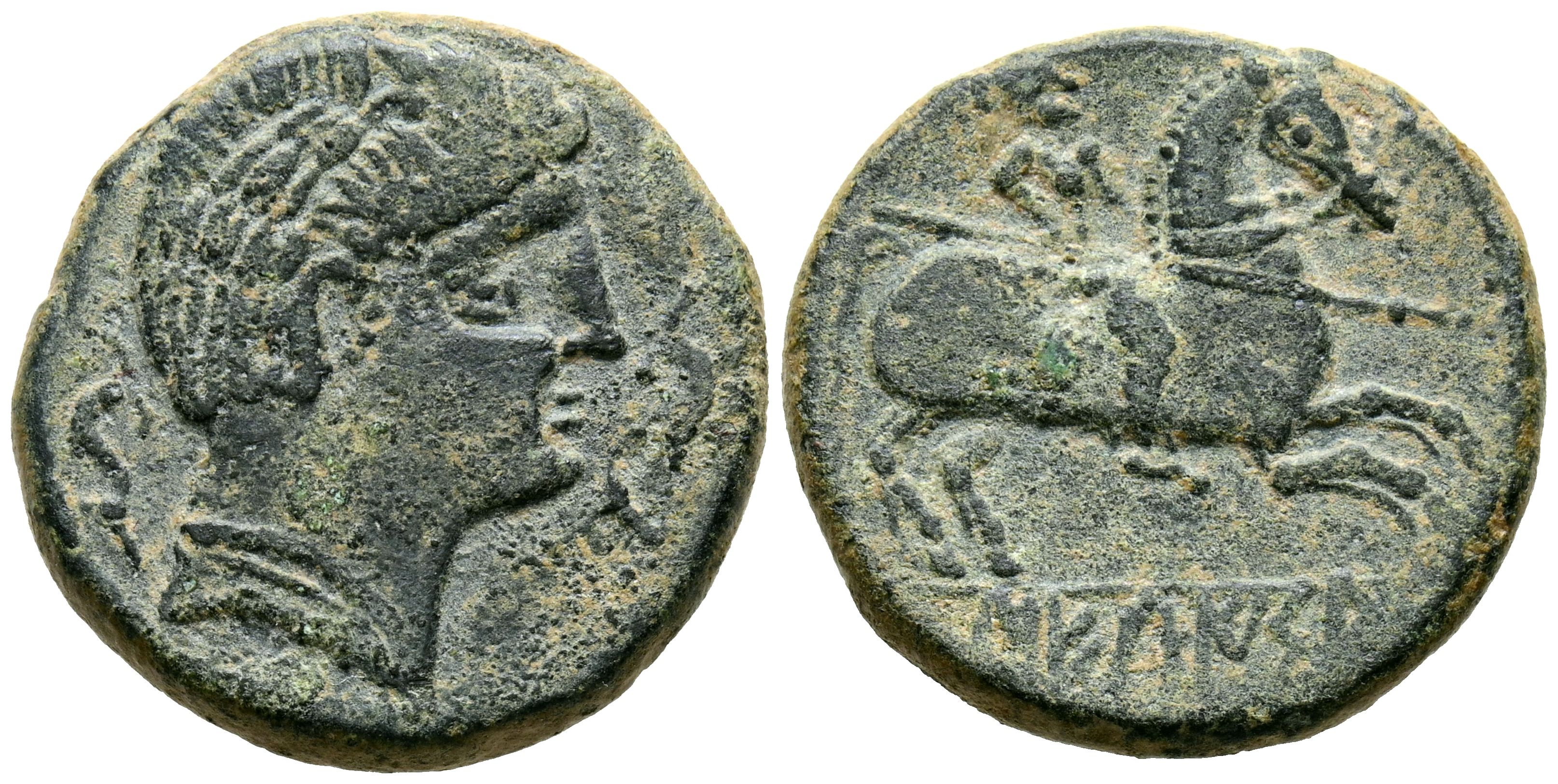 SECAISA (Segeda, Zaragoza). As. (Ae. 8,57g/22mm). 120-20 a.C. (FAB-2131). Anv: Cabeza masculina a derecha, entre dos delfines. Rev: Jinete con lanza a derecha, debajo leyenda ibérica: SECaISA. MBC.