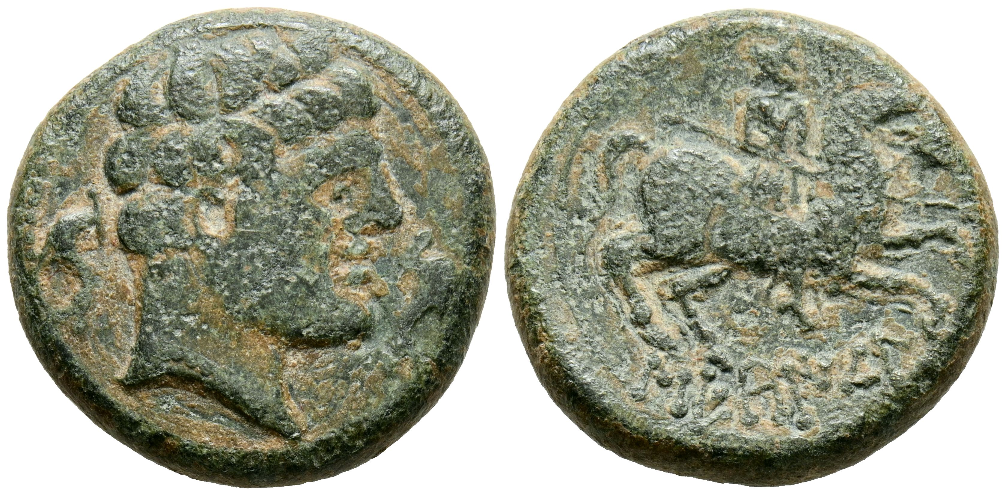 SECAISA (Segeda, Zaragoza). As. (Ae. 11,62g/23mm). 120-20 a.C. (FAB-2137). Anv: Cabeza masculina a derecha, entre dos delfines. Rev: Jinete con lanza a derecha, debajo leyenda ibérica curva: SECaISA. MBC.
