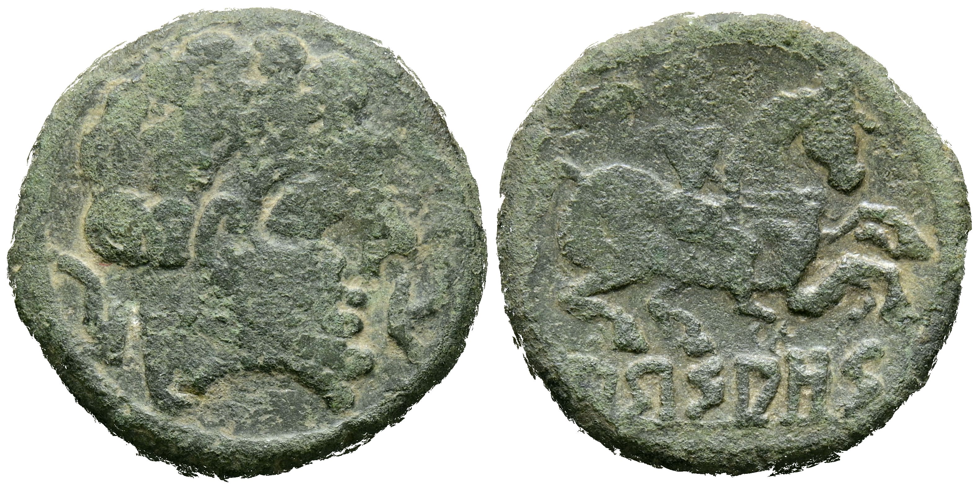 ARSAOS (Zona de Navarra). As. (Ae. 7,18g/22mm). 120-80 a.C. (FAB-145). Anv: Cabeza masculina y barbada a derecha entre dos delfines, arte degenerado. Rev: Jinete con dardo a derecha, debajo de línea leyenda: ARSAOS, arte degenerado. MBC.