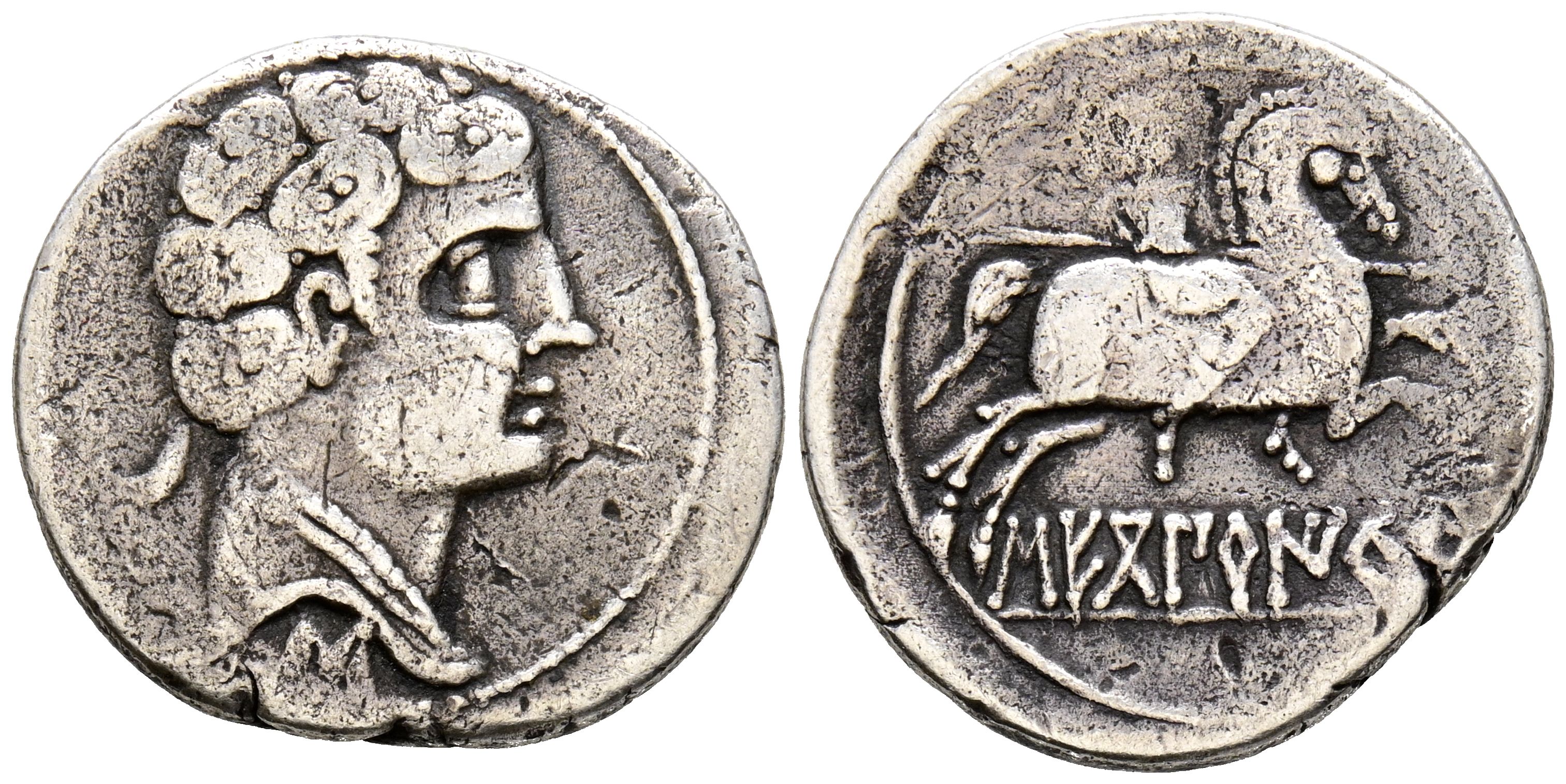 SECOBIRICES (Saelices, Cuenca). Denario. (Ar. 3,48g/20mm). 120-30 a.C. (FAB-2172). Anv: Cabeza masculina a derecha, detrás creciente, debajo letra ibérica: S. Rev: Jinete con lanza a derecha, asomando dos pies, debajo leyenda ibérica sobre línea: SeCoBiRICeS. MBC-.
