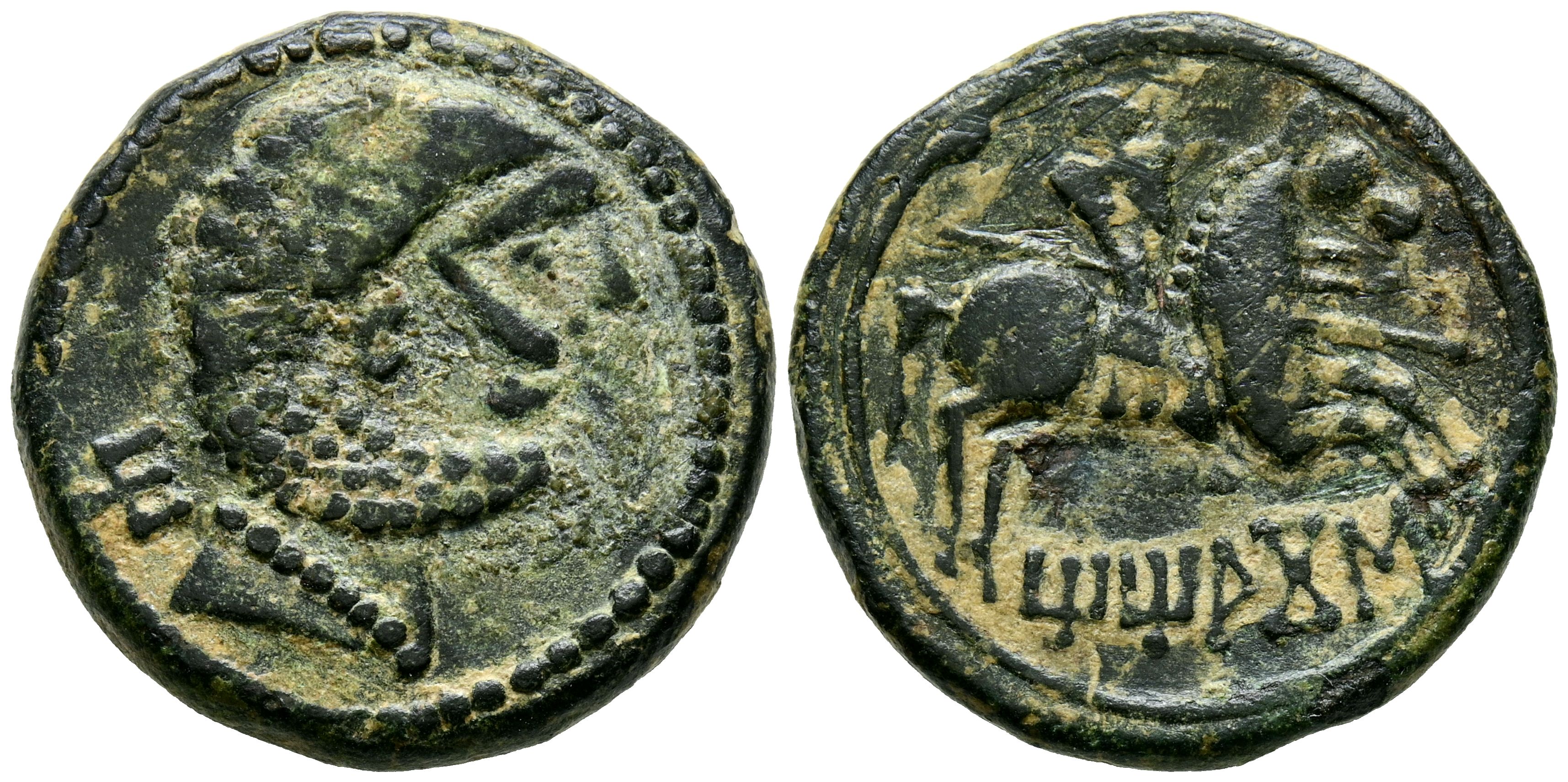 TITIACOS (Tricio, La Rioja). As. (Ae. 9,13g/24mm). 120-20 a.C. (FAB-2394). Anv: Cabeza masculina barbada a derecha, detrás letra ibérica: Ti. Rev: Jinete con lanza a derecha, debajo leyenda ibérica: TiTiACoS. MBC-.
