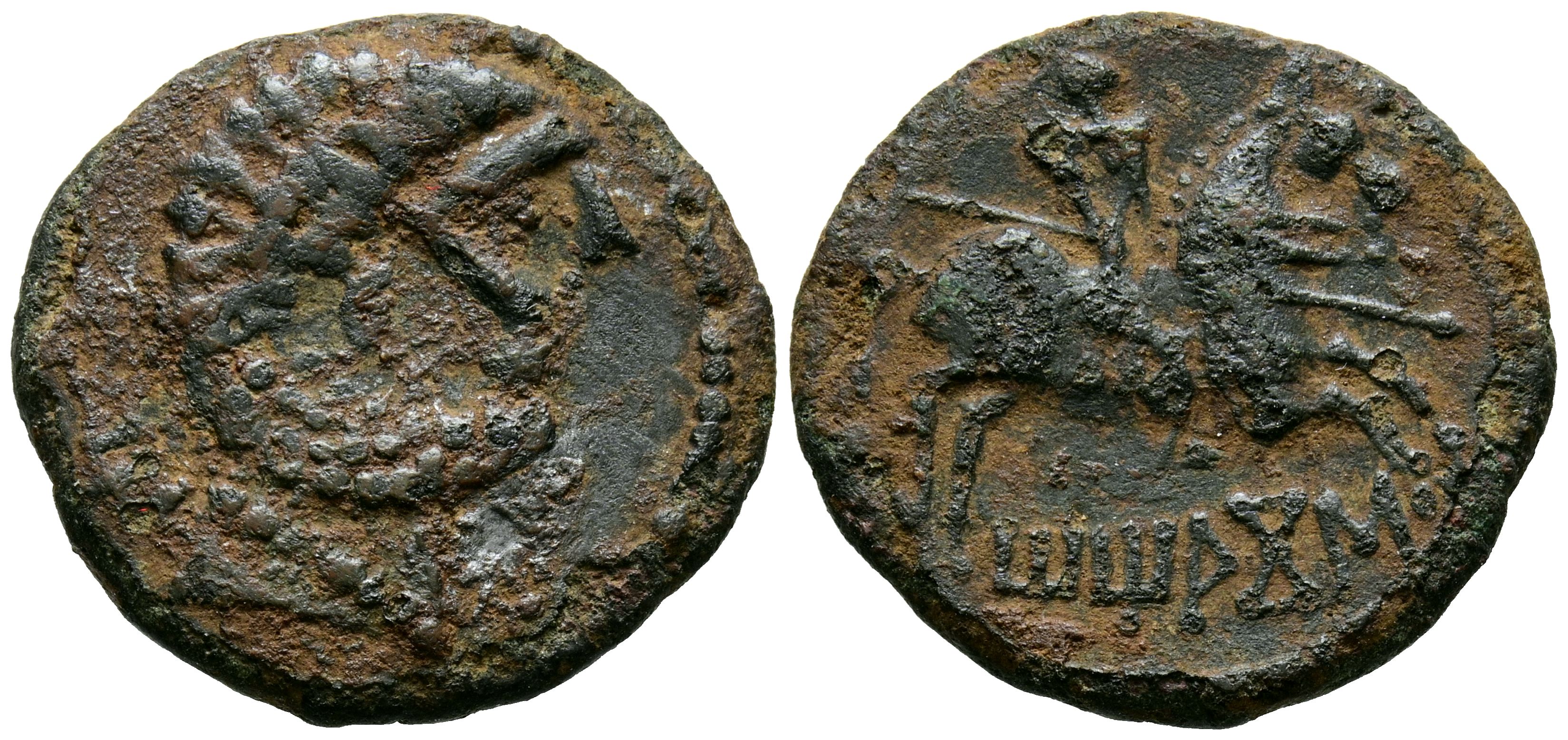 TITIACOS (Tricio, La Rioja). As. (Ae. 5,26g/23mm). 120-20 a.C. (FAB-2394). Anv: Cabeza masculina barbada a derecha, detrás letra ibérica: Ti. Rev: Jinete con lanza a derecha, debajo leyenda ibérica: TiTiACoS. MBC-. Limpiado.