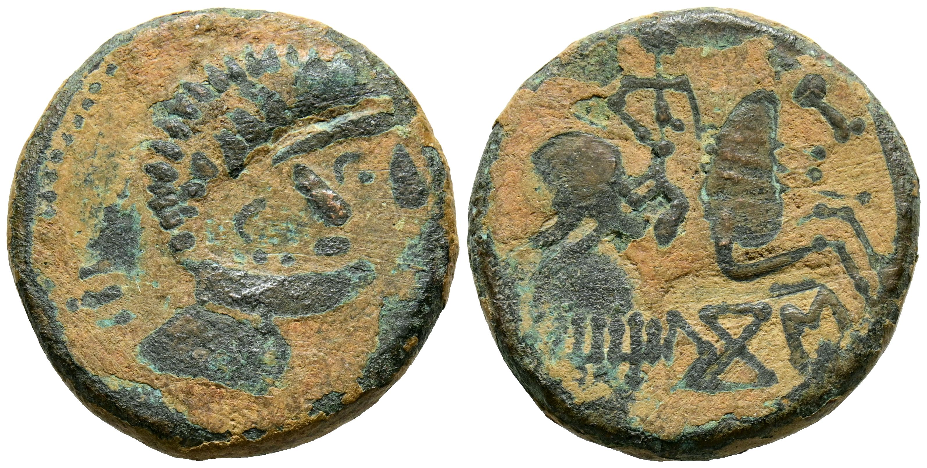 TITIACOS (Tricio, La Rioja). As. (Ae. 8,26g/22mm). 120-20 a.C. (FAB-2394). Anv: Cabeza masculina barbada a derecha, detrás letra ibérica: Ti. Rev: Jinete con lanza a derecha, debajo leyenda ibérica: TiTiACoS. BC+.