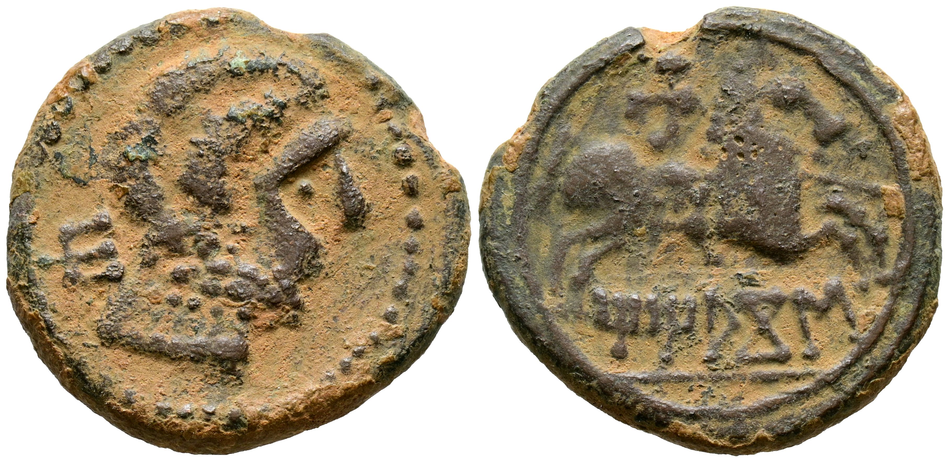 TITIACOS (Tricio, La Rioja). As. (Ae. 9,10g/25mm). 120-20 a.C. (FAB-2395). Anv: Cabeza masculina barbada a derecha, detrás letra ibérica: Ti. Rev: Jinete con lanza a derecha, debajo leyenda ibérica sobre linea: TiTiACoS. BC+/MBC-.