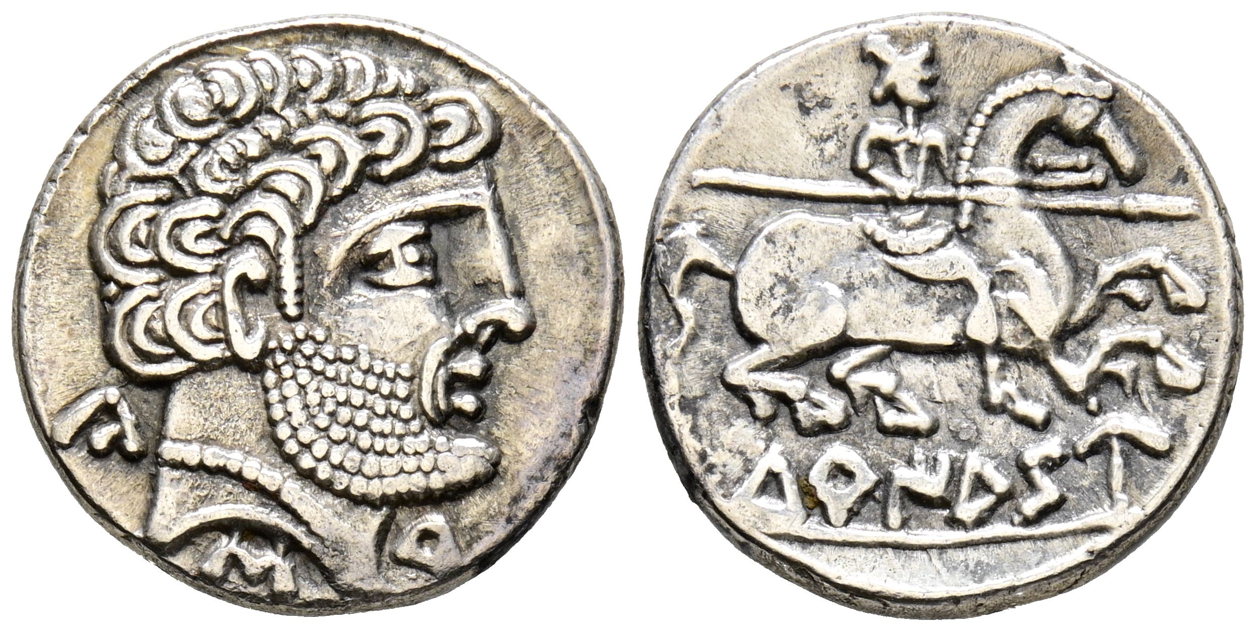 TURIASO (Tarazona, Zaragoza). Denario. (Ar. 3,65g/17mm). 120-20 a.C. (FAB-2412). Anv: Cabeza masculina barbada a derecha, detrás letra: CA, debajo: S y delante: Du. Rev: Jinete con lanza a derecha, debajo leyenda ibérica sobre línea: TuRIASU. MBC+.