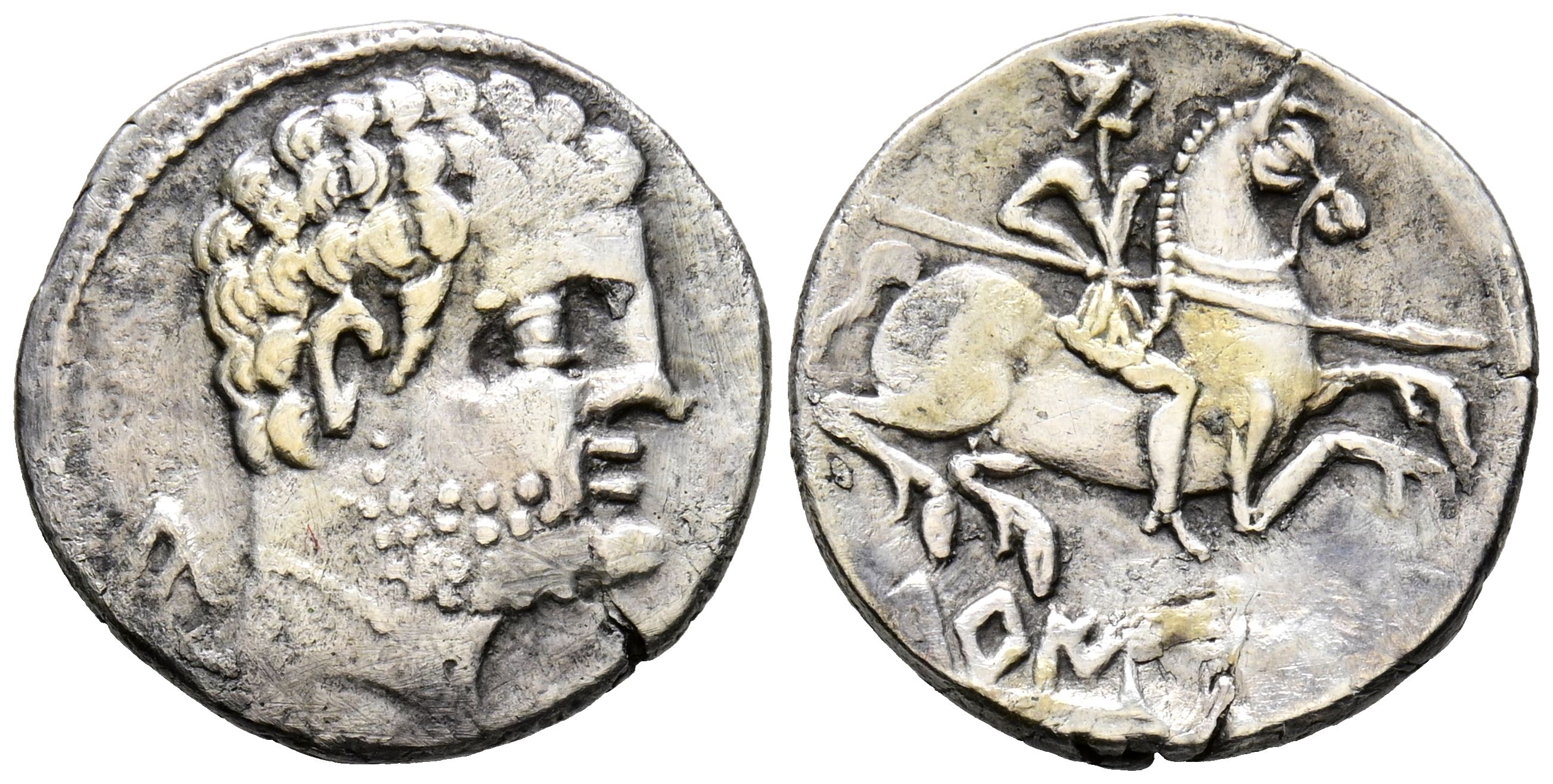 TURIASO (Tarazona, Zaragoza). Denario. (Ar. 2,60g/18mm). 120-20 a.C. (FAB-2412). Anv: Cabeza masculina barbada a derecha, detrás letra: CA, debajo: S y delante: Du. Rev: Jinete con lanza a derecha, debajo leyenda ibérica sobre línea: TuRIASU. MBC-. Vanos de acuñación.