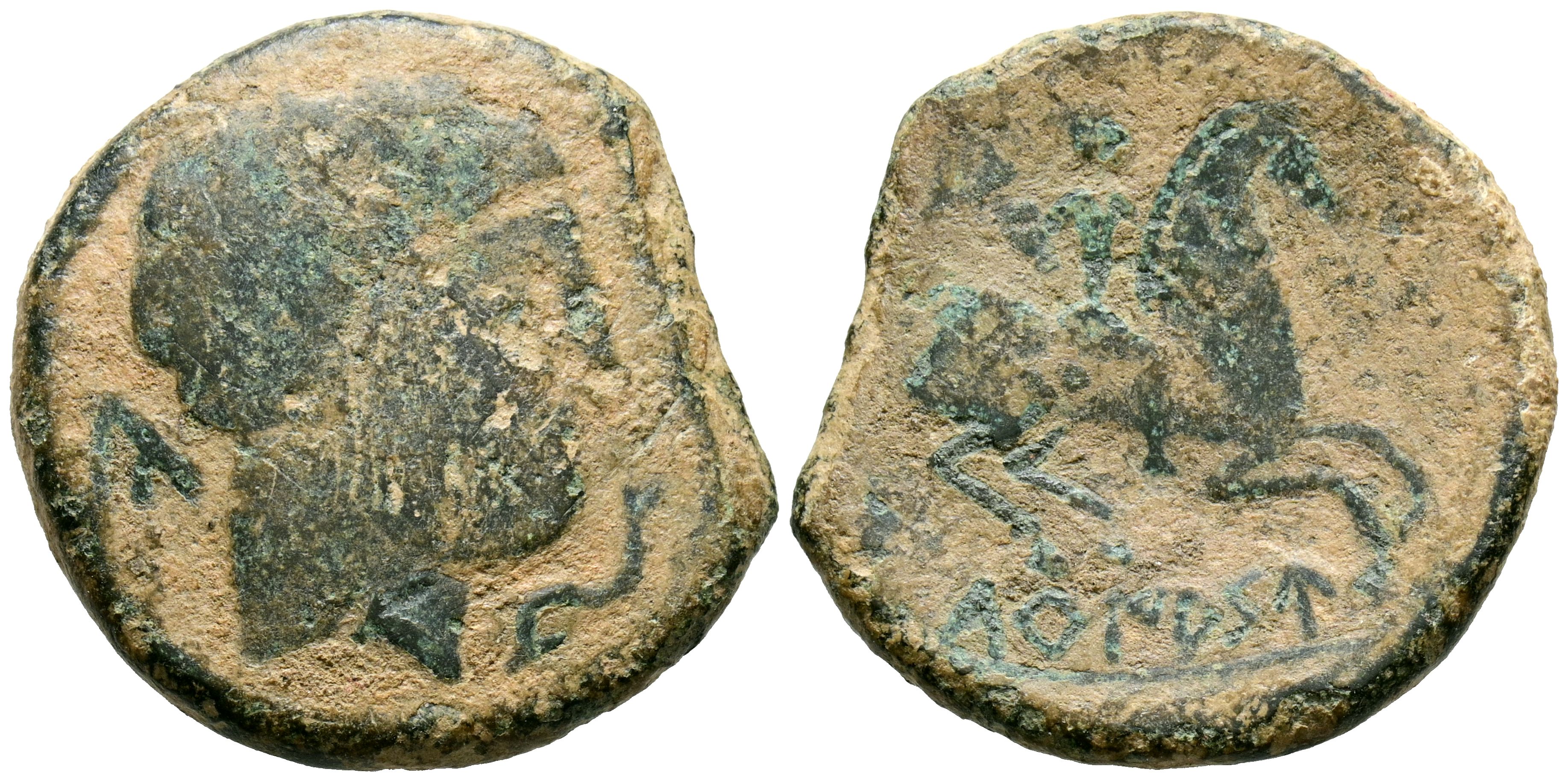 TURIASO (Tarazona, Zaragoza). As. (Ae. 9,80g/26mm). 120-20 a.C. (FAB-2424). Anv: Cabeza masculina barbada a derecha, delante delfín, detrás letra ibérica: Ca. Rev: Jinete con lanza a derecha, debajo leyenda ibérica sobre línea: TuRIASU. BC+. Cospel faltado.