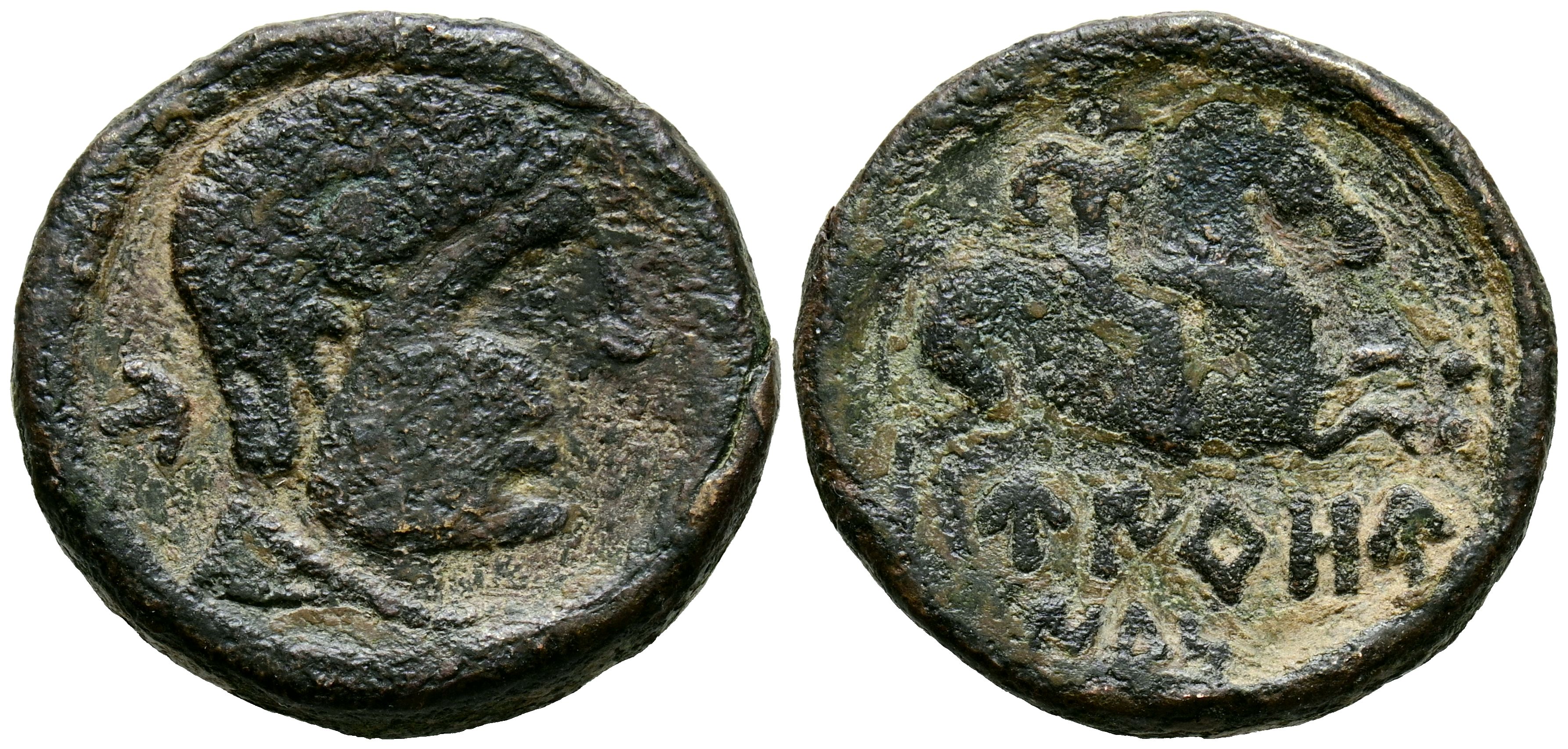 UIROUIAS (Borobia, Soria). As. (Ae. 11,04g/25mm). 120-20 a.C. (FAB-2482). Anv: Cabeza masculina a derecha, detrás letras ibéricas: U. Rev: Jinete con lanza a derecha, debajo leyenda ibérica en dos partes: UIROU/IAS. BC+.