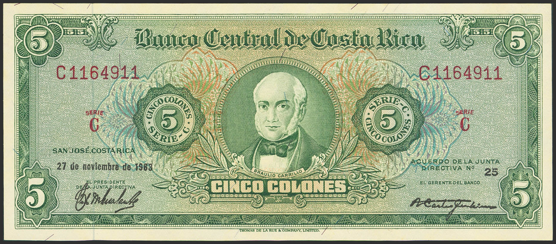 COSTA RICA. 5 Colones. 27 November 1963. (Pick: 228). Uncirculated.