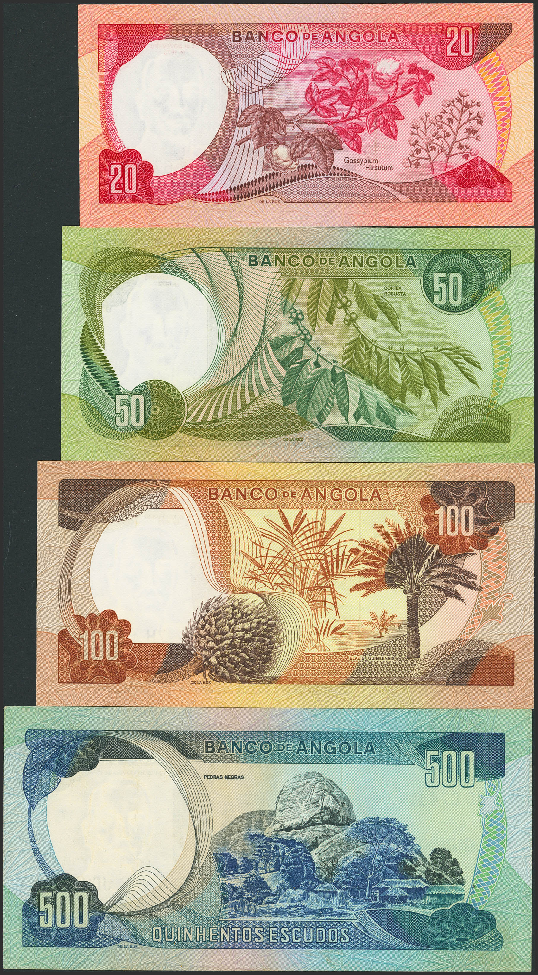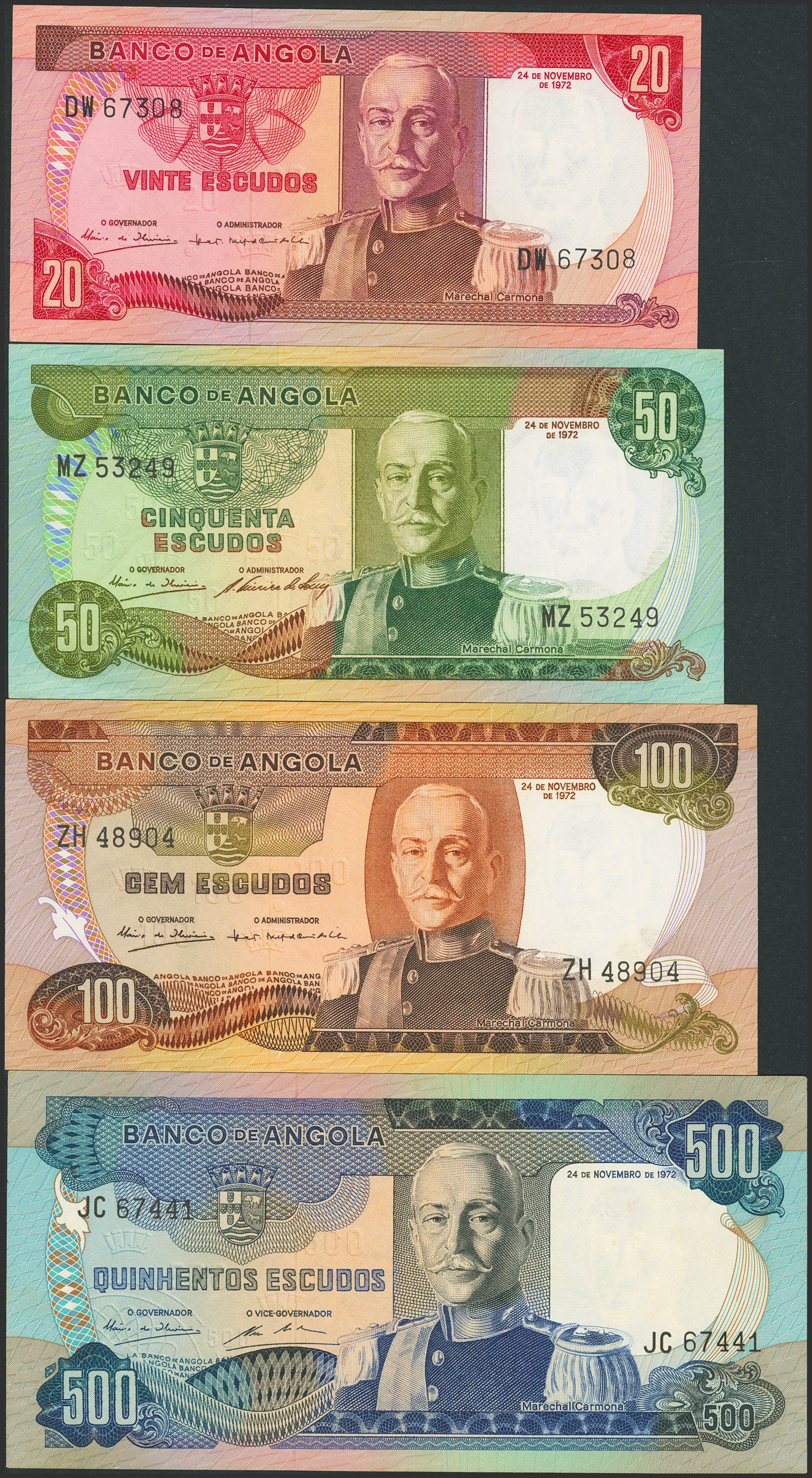 Set of 4 banknotes of Angola of 20 Escudos, 50 Escudos, 100 Escudos and 500 Escudos. 24 November 1972. (Pick: 99, 100, 101, 102). Uncirculated / Extremely Fine.