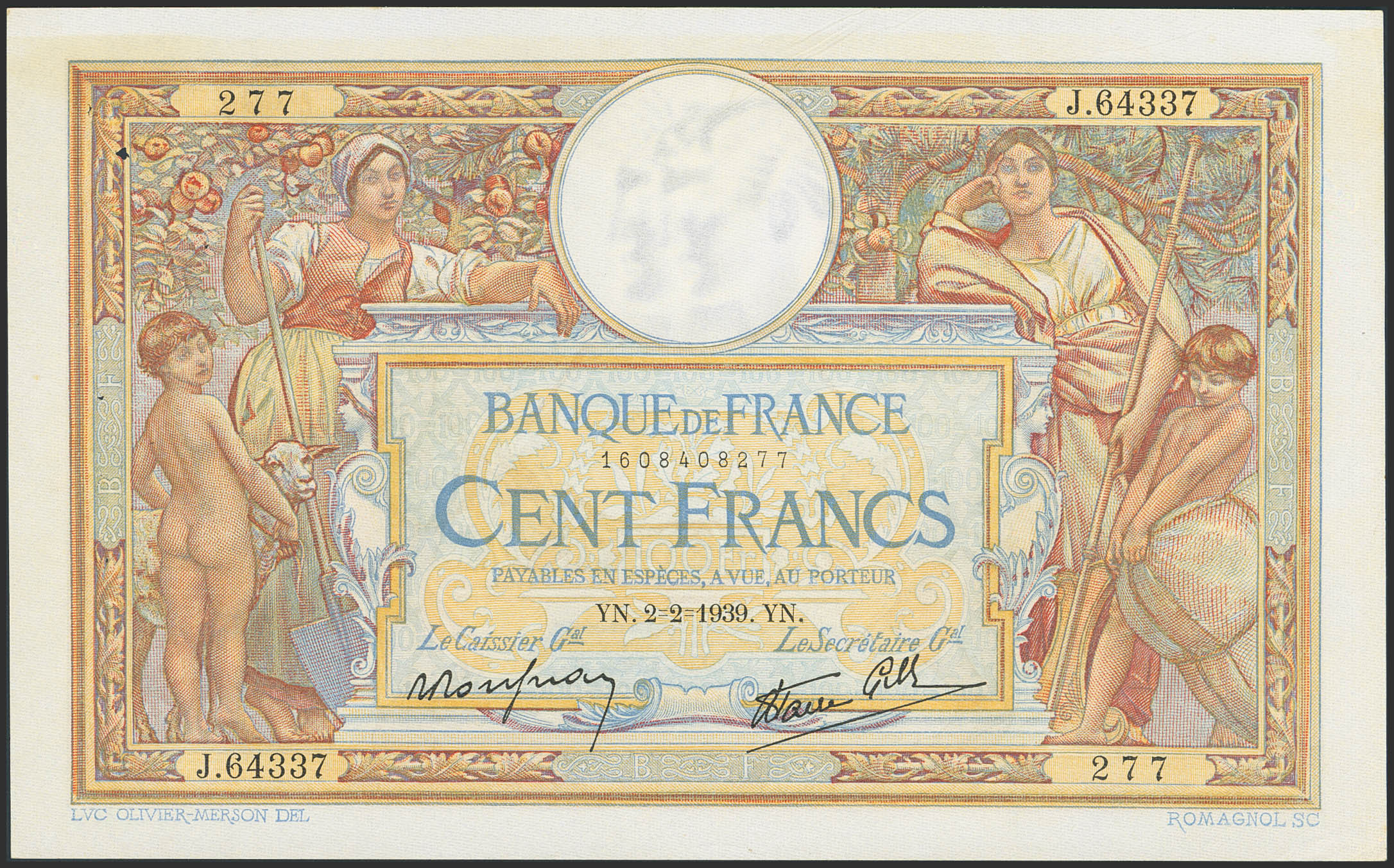 FRANCE. 100 Francs. 2 February 1939. (Pick: 78). Needle points. Less than Extremely Fine.