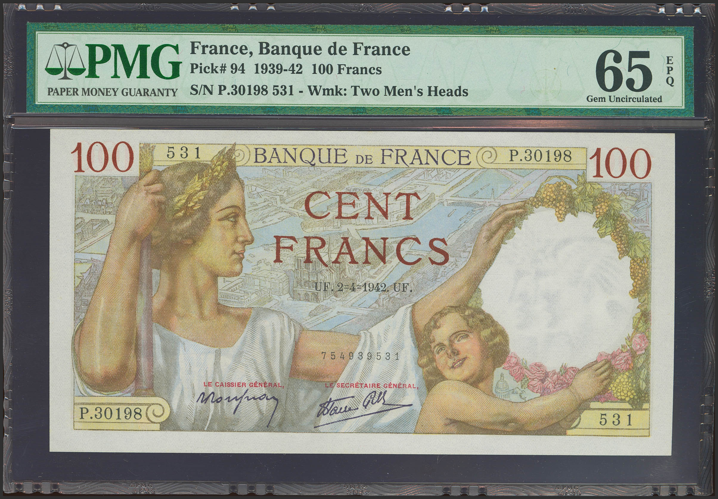 FRANCE. 100 Francs. 2 April 1942. (Pick: 94). PMG65EPQ.