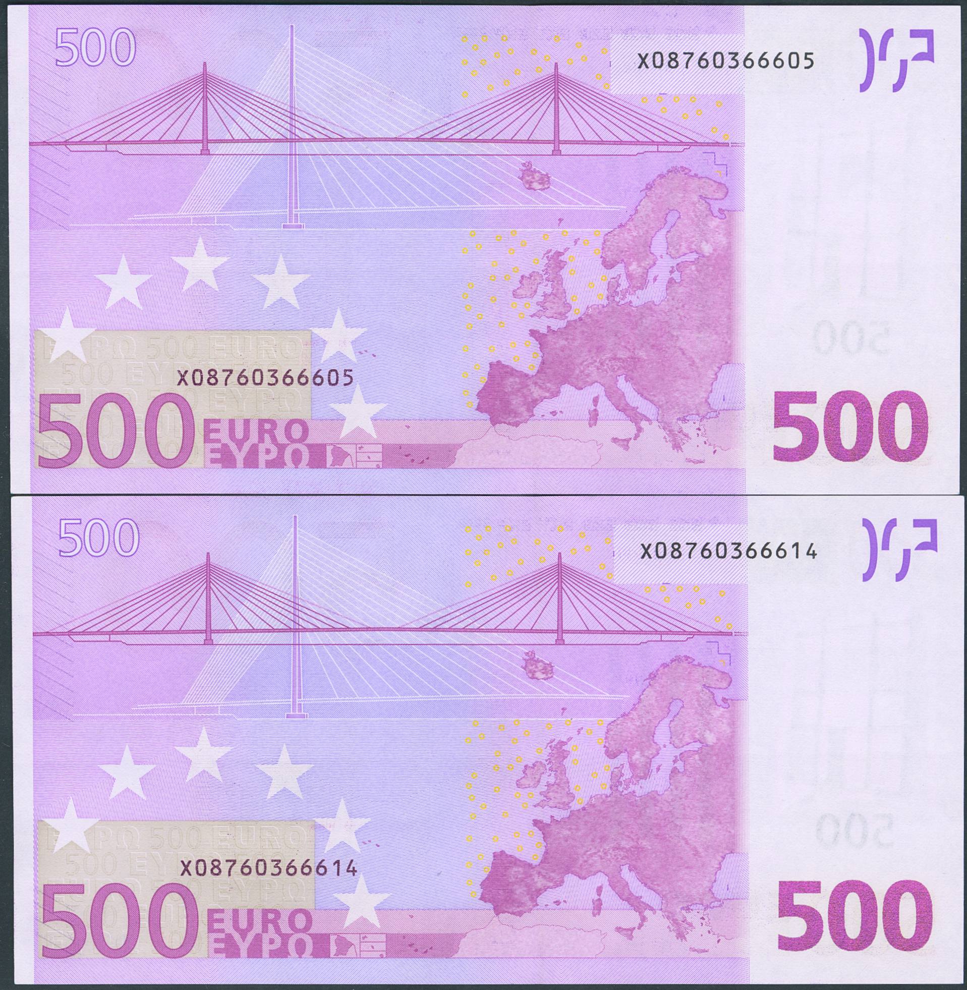 500 Euros. 1 January 2002. Consecutive pair (it should be recalled that the last digit of all euro banknotes is for internal control by the European Central Bank, the penultimate digit is the correlative digit of the banknotes). Trichet signature. Serial X (Germany) (Pick: 7x). Uncirculated.