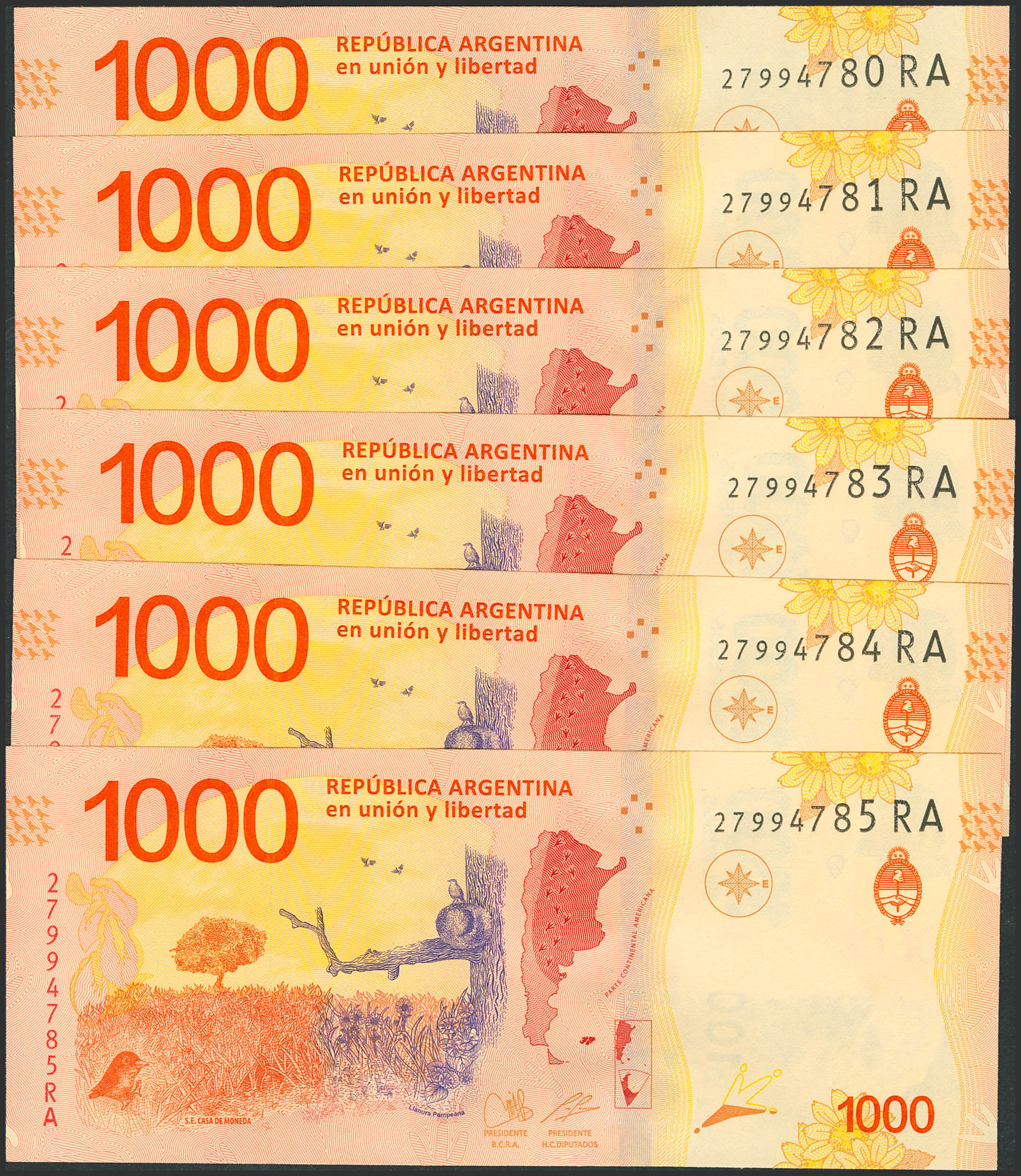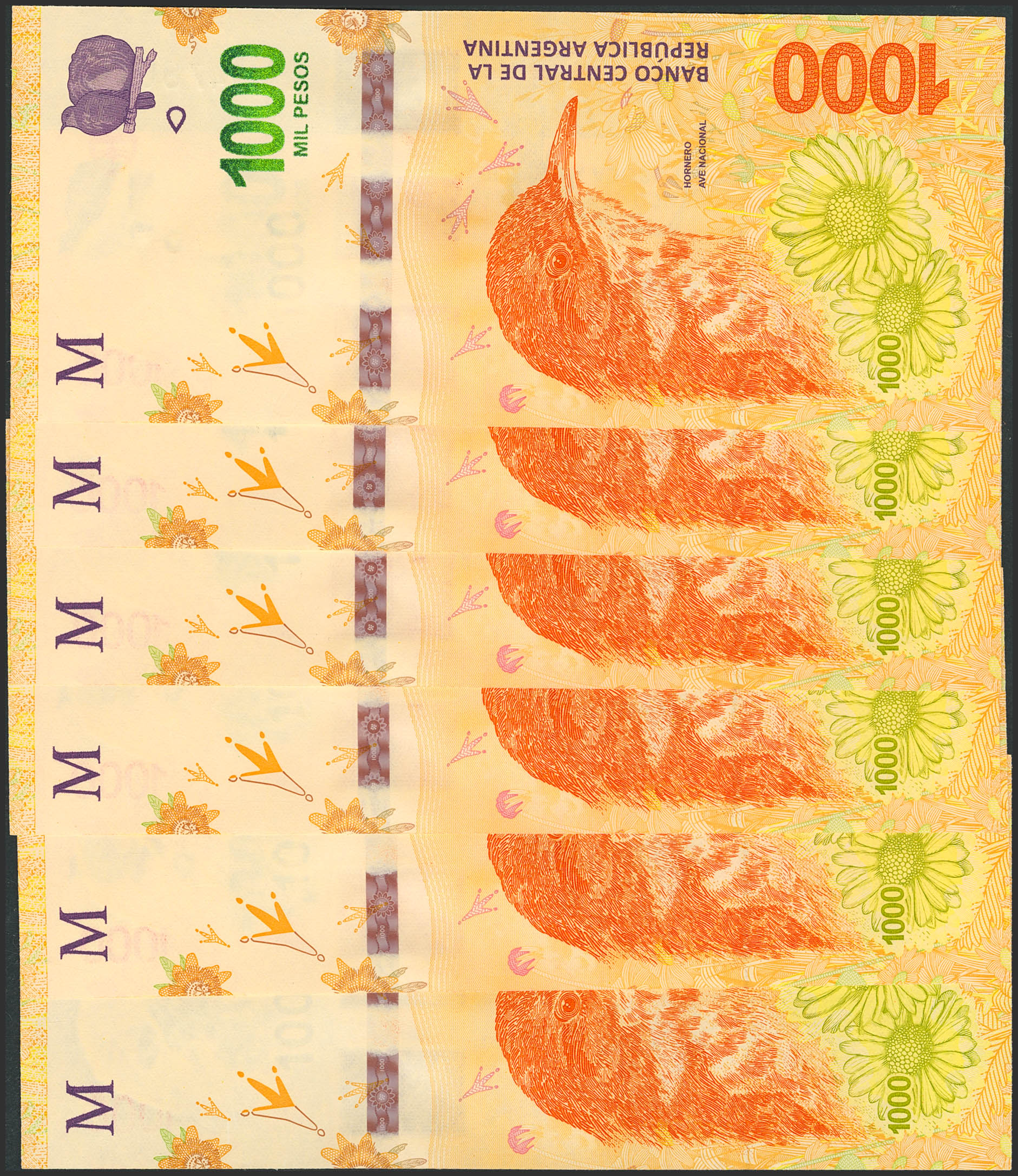 Set of 6 banknotes correlative of Argentina of 1000 Pesos. (2017ca). (Pick: 366). Uncirculated.