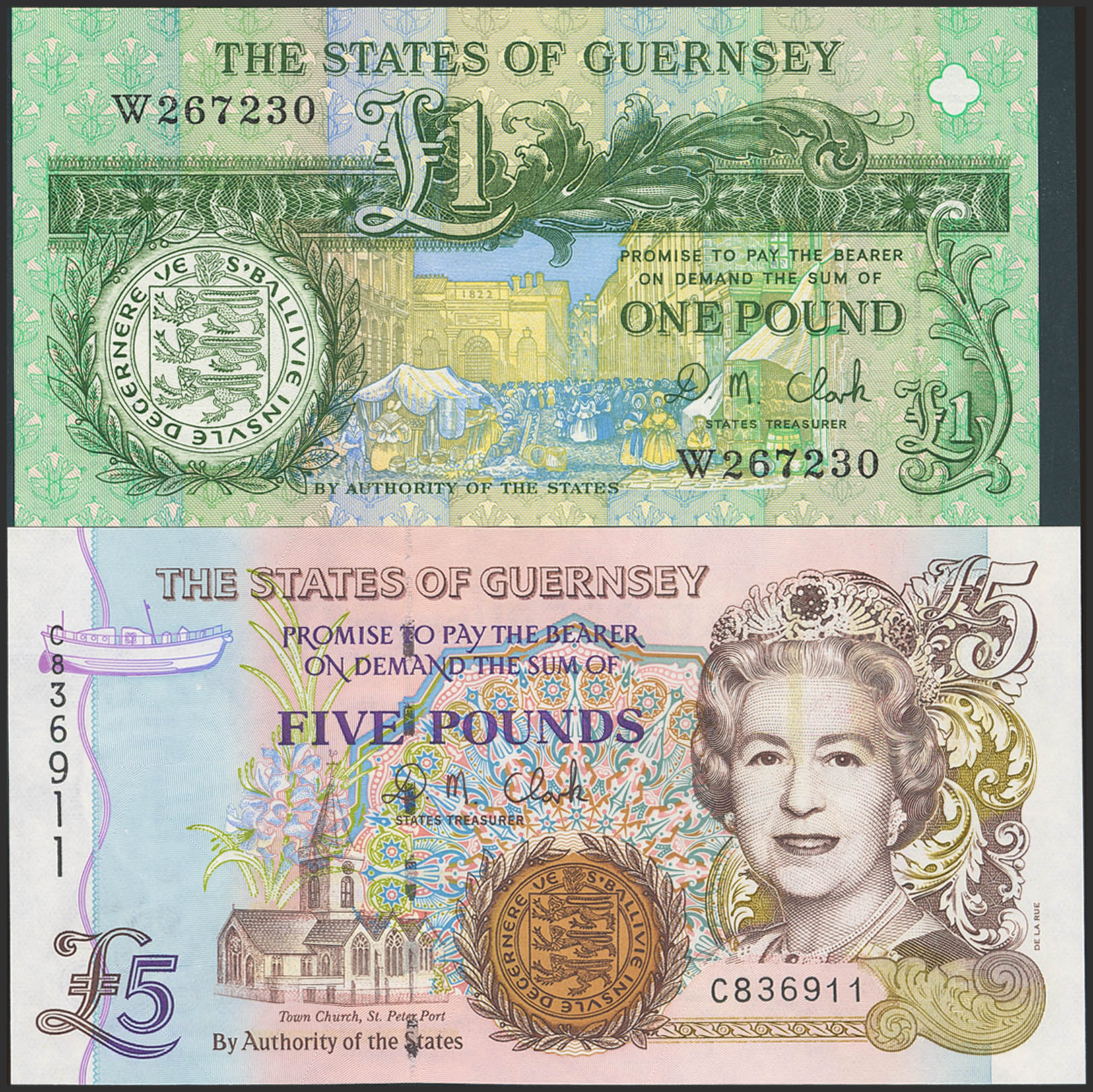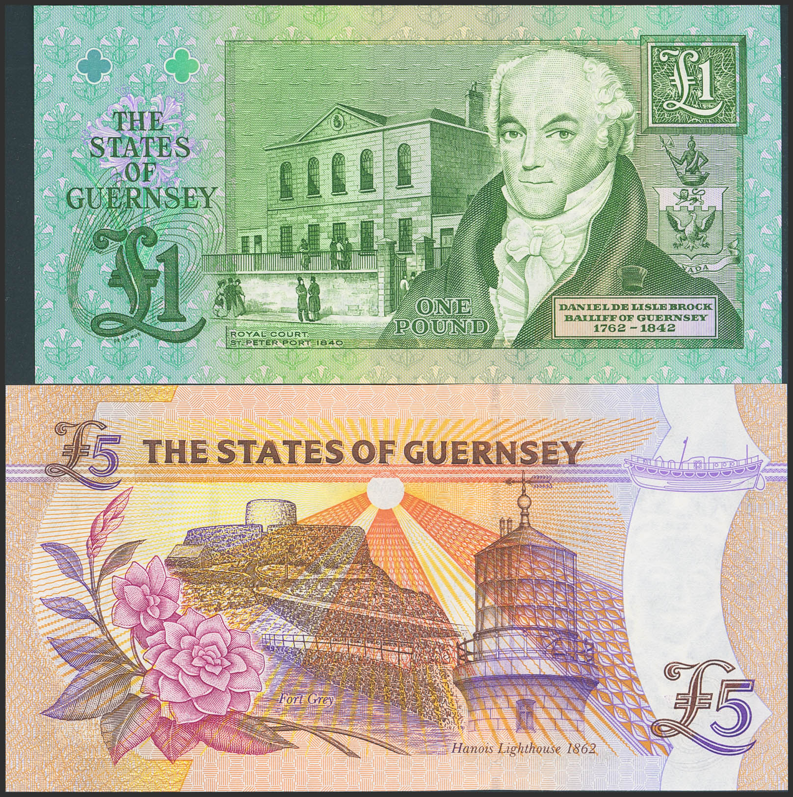 GUERNSEY. 1 Pound and 5 Pounds. (1992ca). (Pick: 52c, 56b). Uncirculated / About Uncirculated.