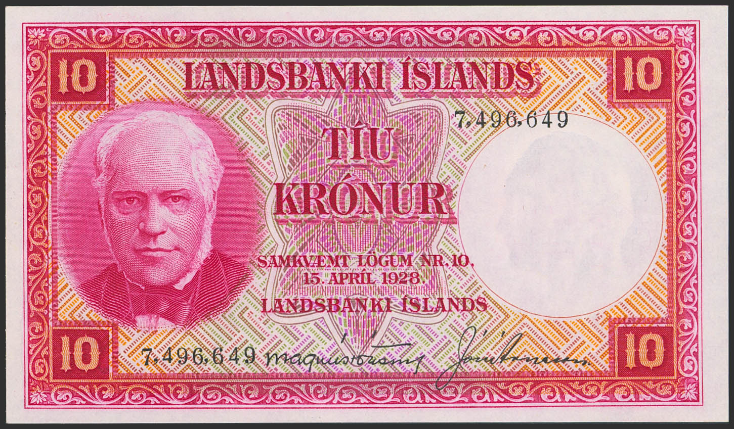 ICELAND. 10 Kronur. 15 April 1928. (Pick: 33). Less than Uncirculated.