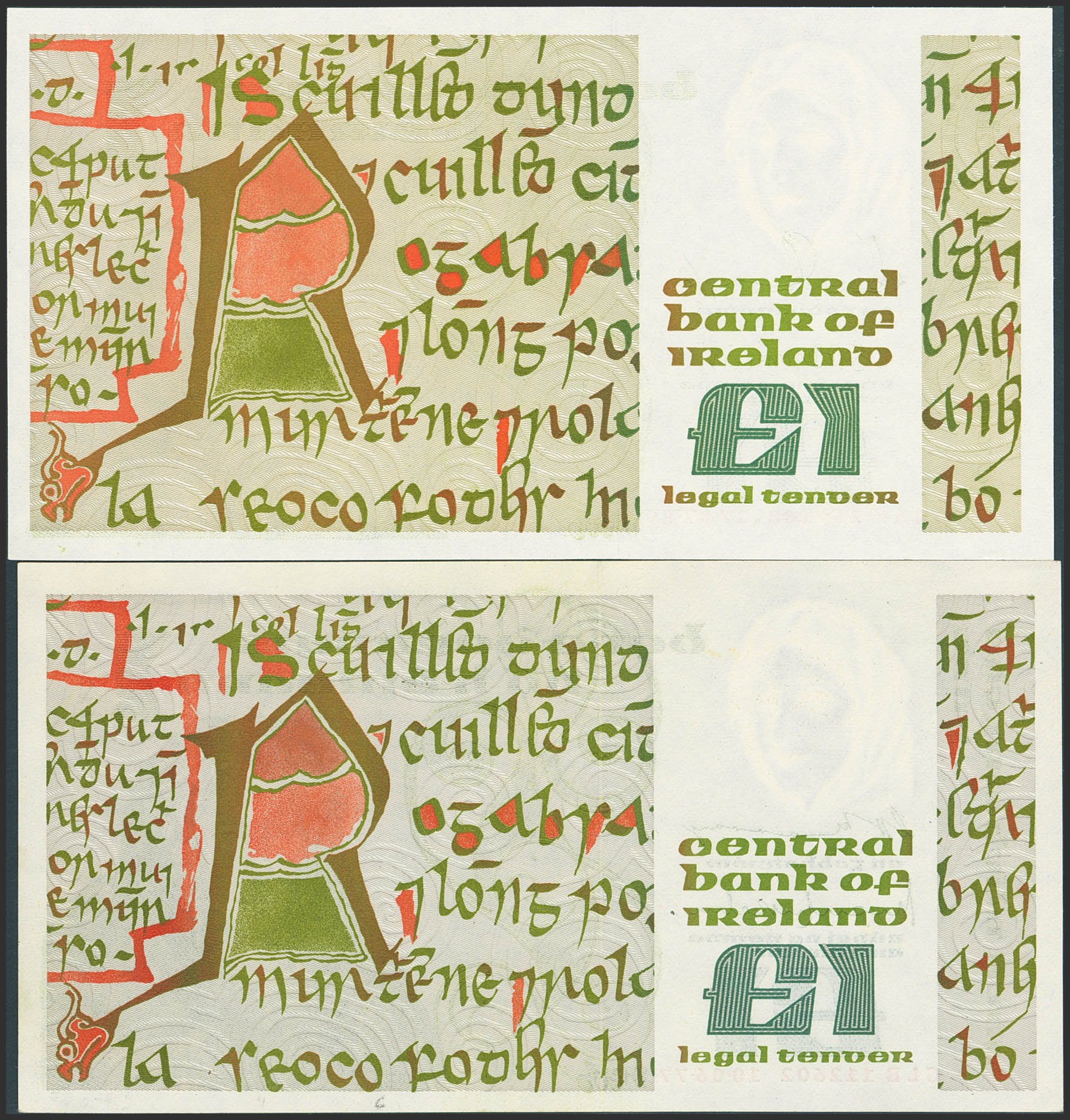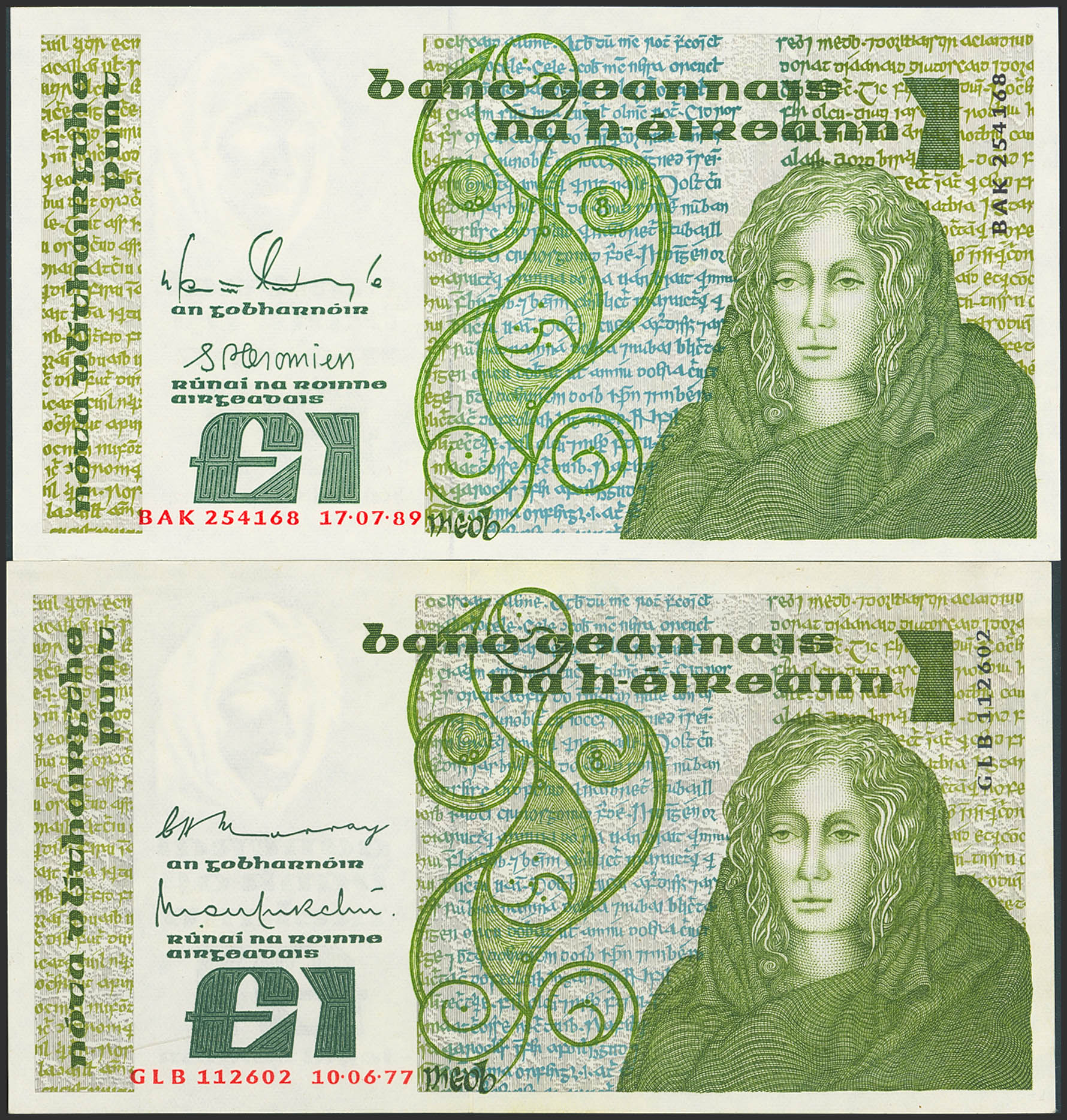 Set of 2 banknotes of Ireland of 1 Pound. 10 June 1977 and 17 July 1989. (Pick: 70a, 70d). Less than Uncirculated / Uncirculated.